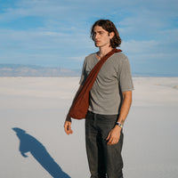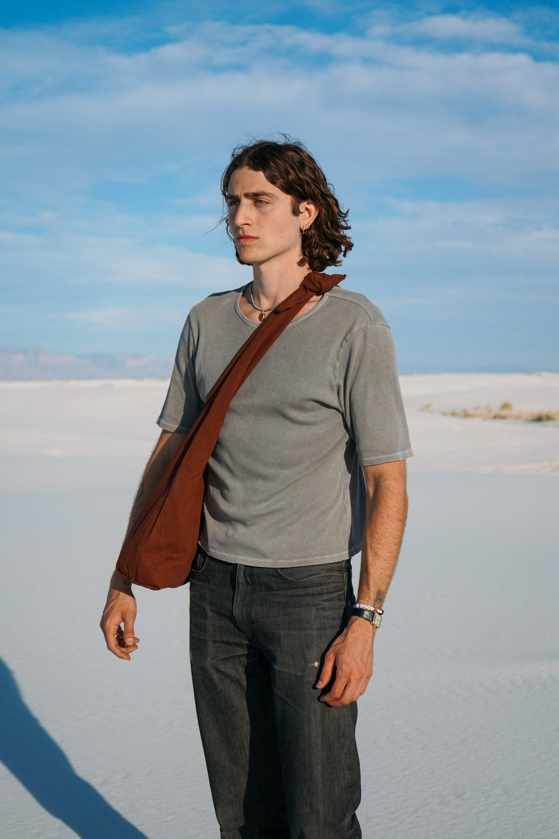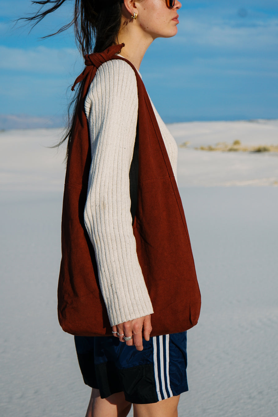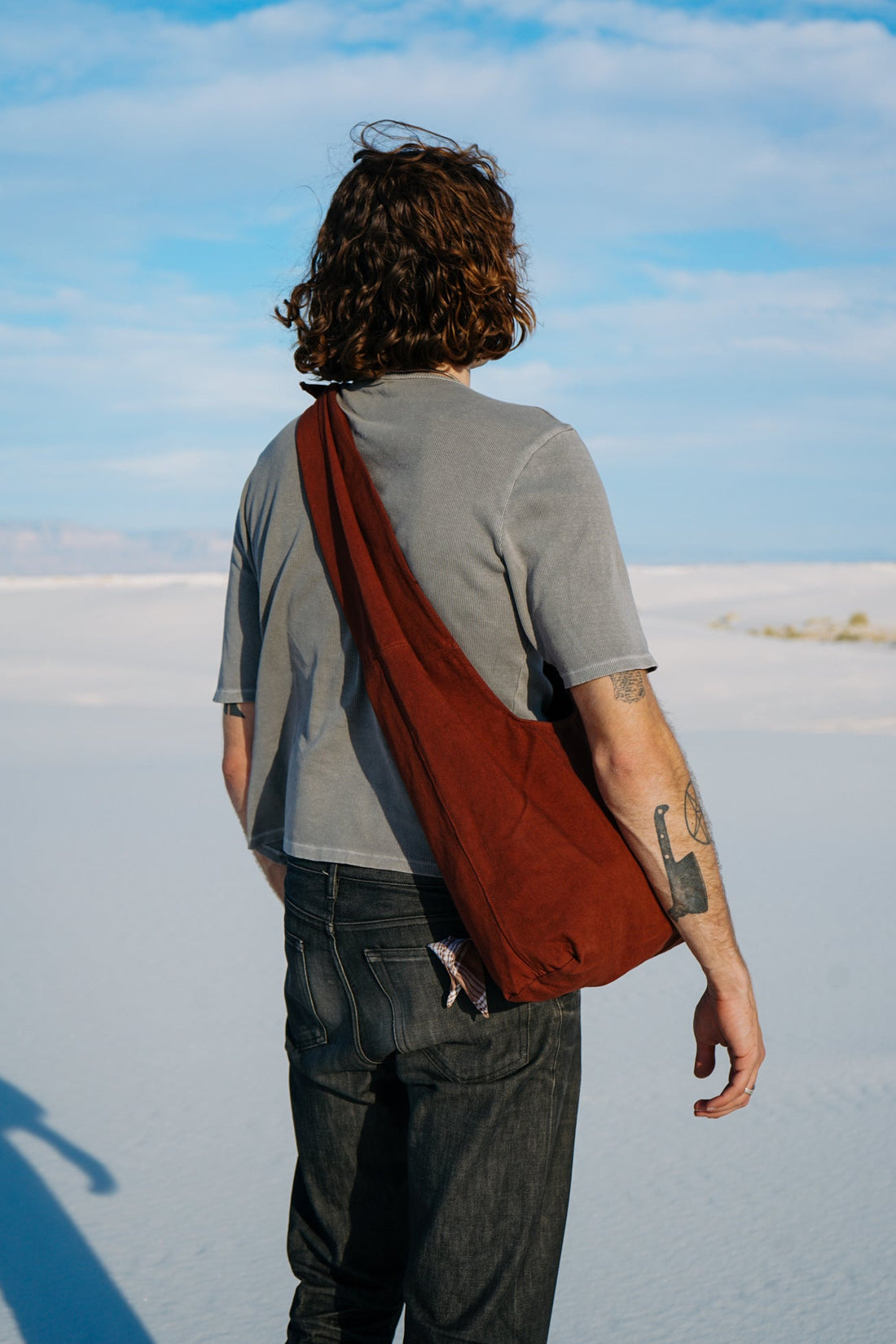 Standard size Tsuno Bag. Worn as a shoulder bag or secure-fitting crossbody. Adjustable overhand knot. 105cm armhole circumference. 65cm arm length. 14 liter capacity. Single open compartment. Double fold finishing. Raw ears with bar tack.