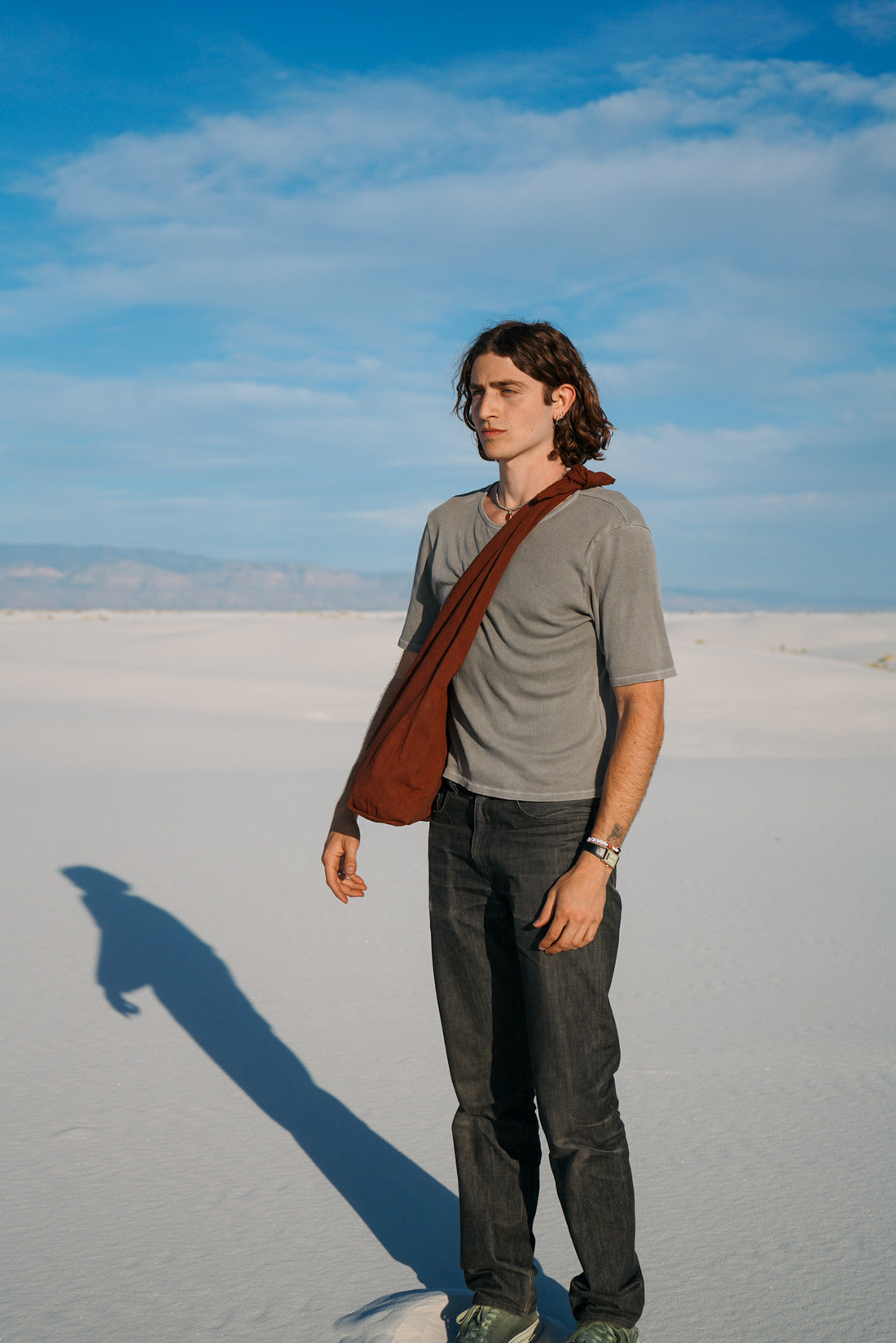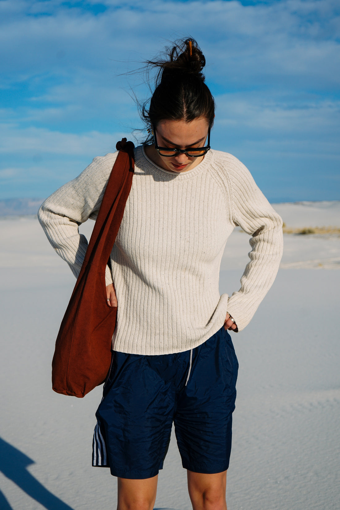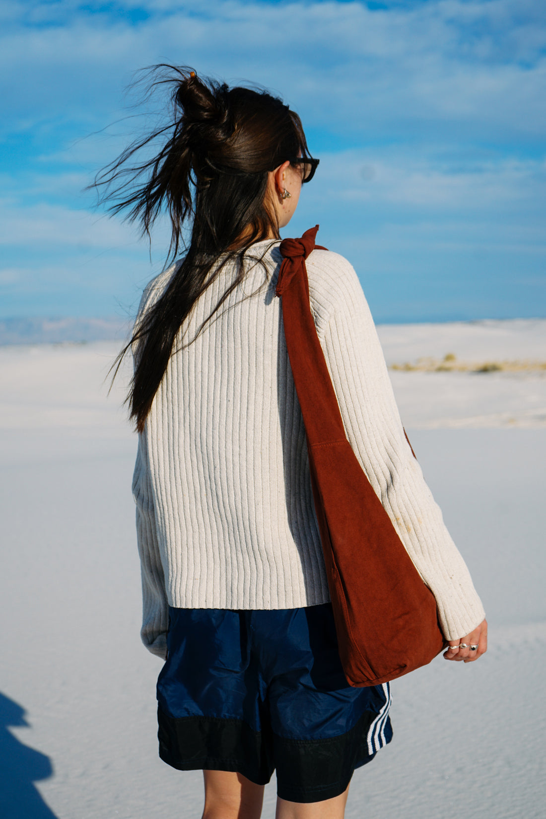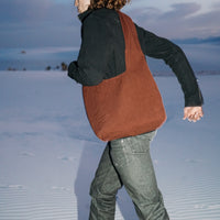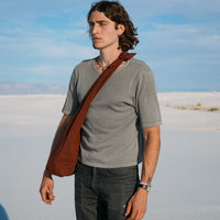 Standard size Tsuno Bag. Worn as a shoulder bag or secure-fitting crossbody. Adjustable overhand knot. 105cm armhole circumference. 65cm arm length. 14 liter capacity. Single open compartment. Double fold finishing. Raw ears with bar tack.