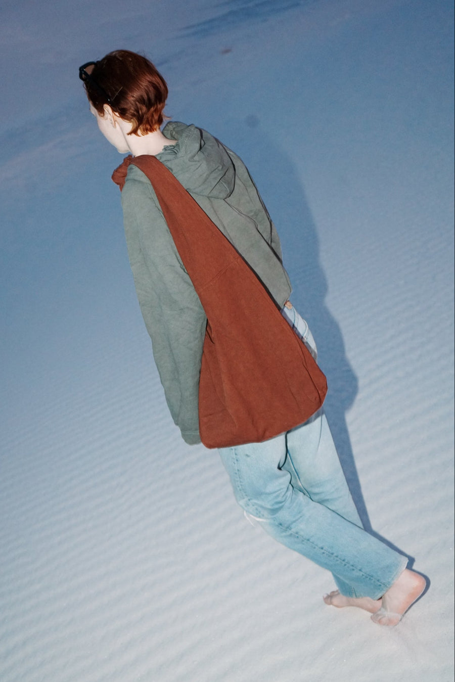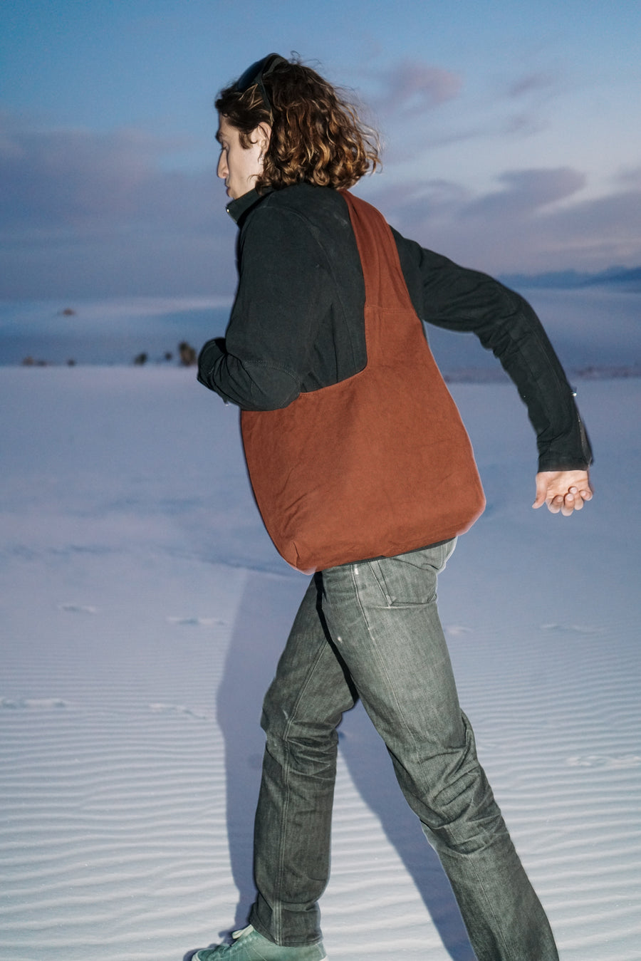 12oz twill for increased durability and natural water repellency. Fabric milled in the US and sourced secondhand in Los Angeles. Originally developed as more utilitarian dust bag for our footwear, this bag has grown to become an everyday go-to.