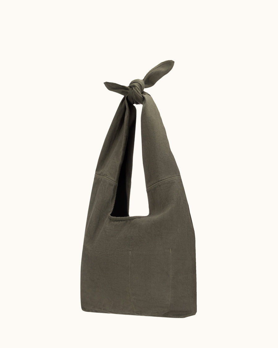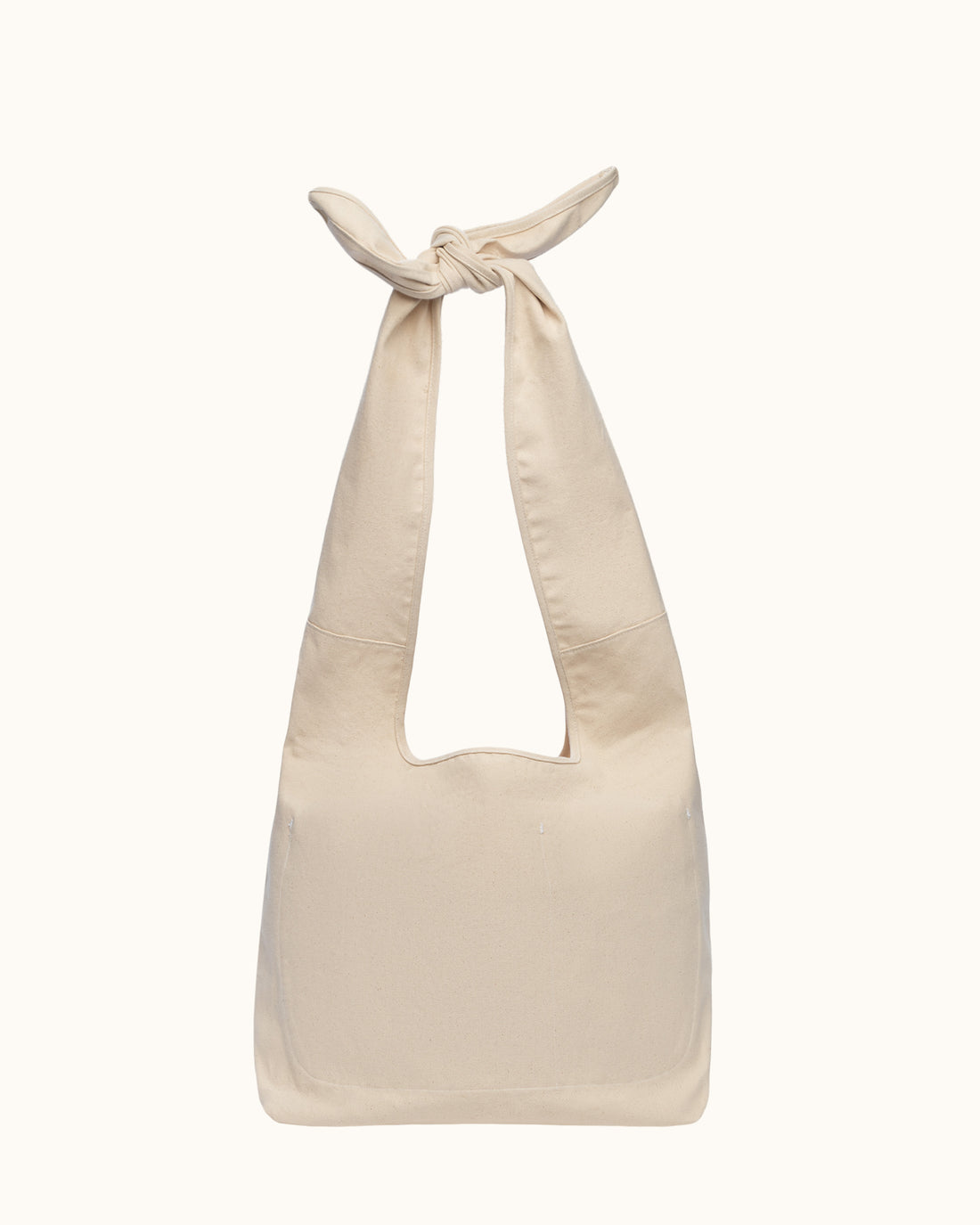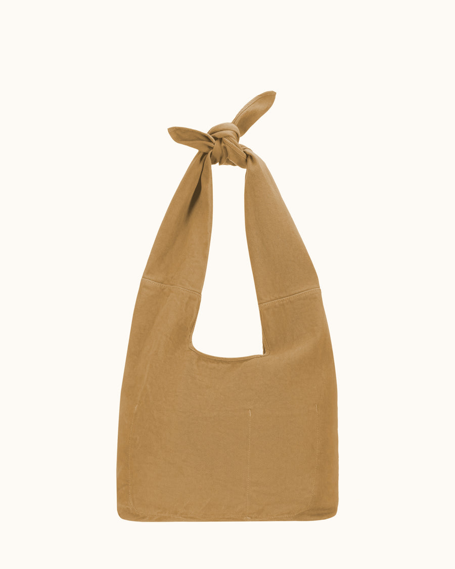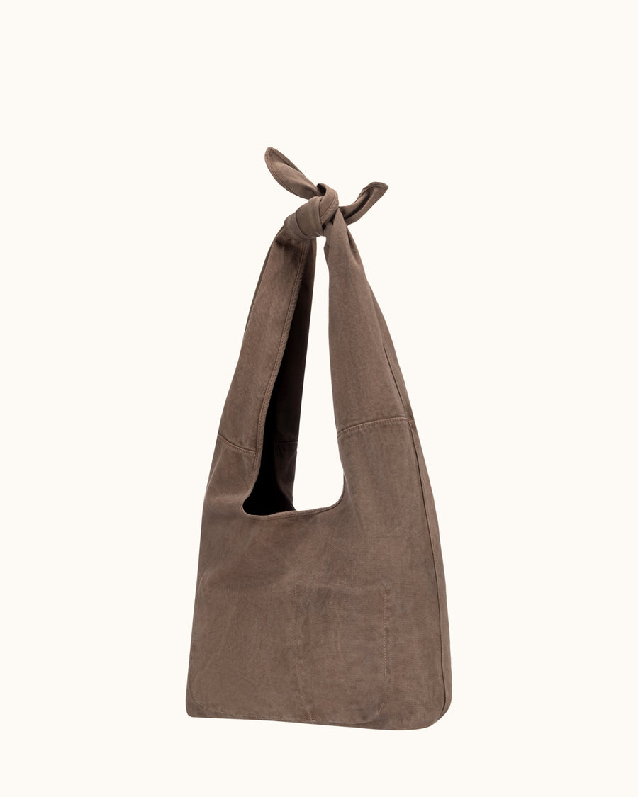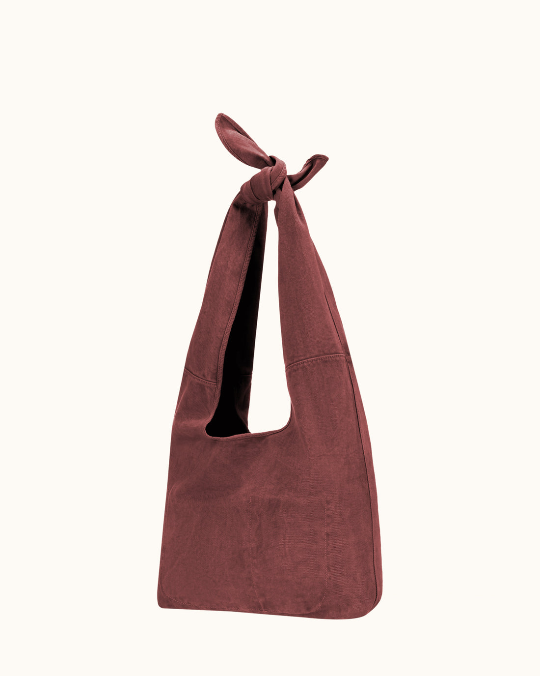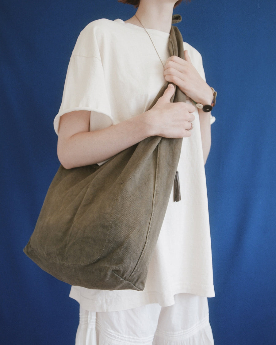 Worn as a shoulder bag or crossbody. Adjustable overhand knot. Dyed versions: 105cm armhole circumference. 65cm arm length. 14 liter capacity. Bias tape finishing. Internal pockets with exterior stitch.