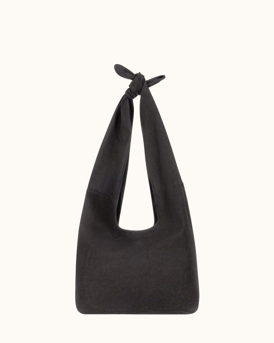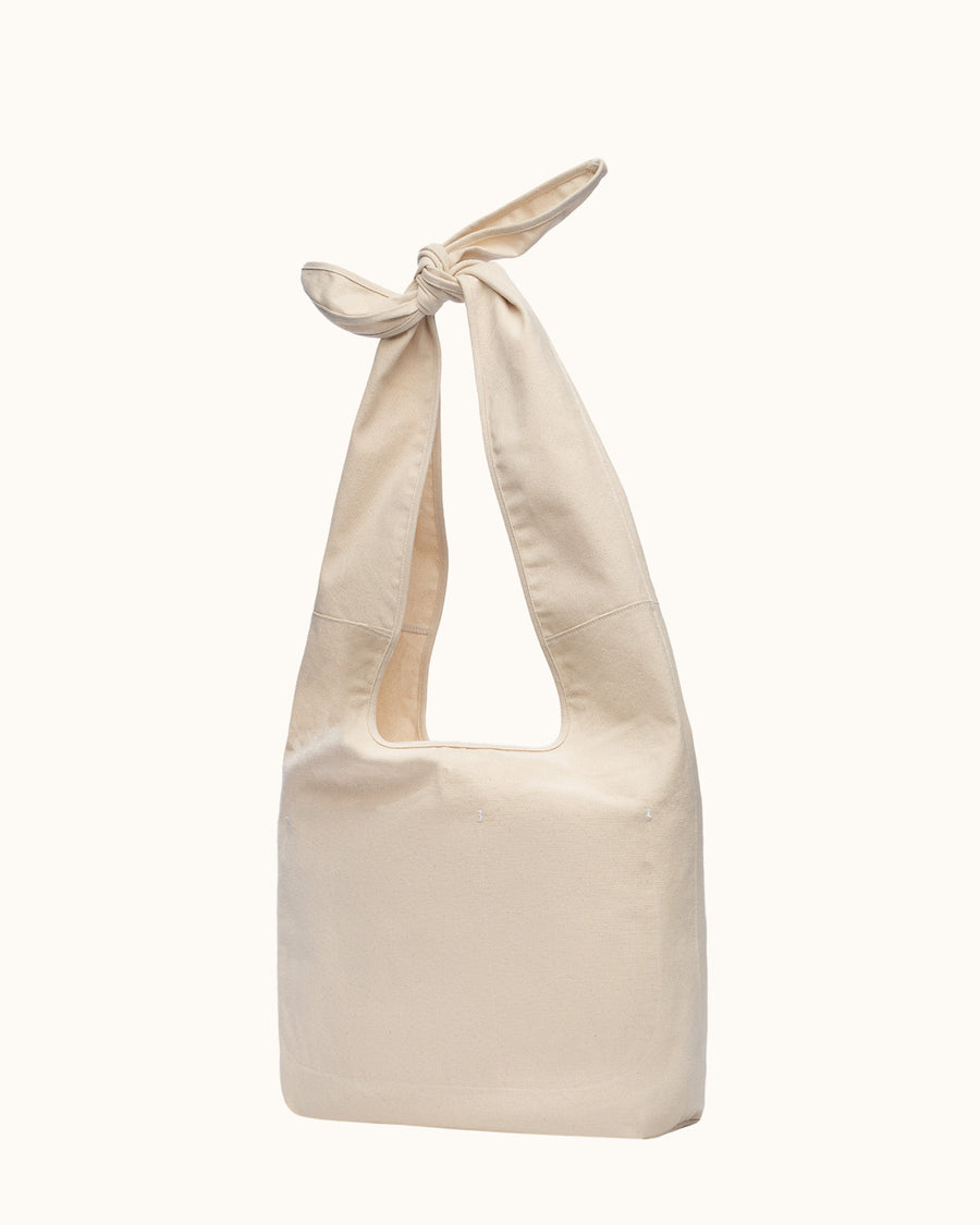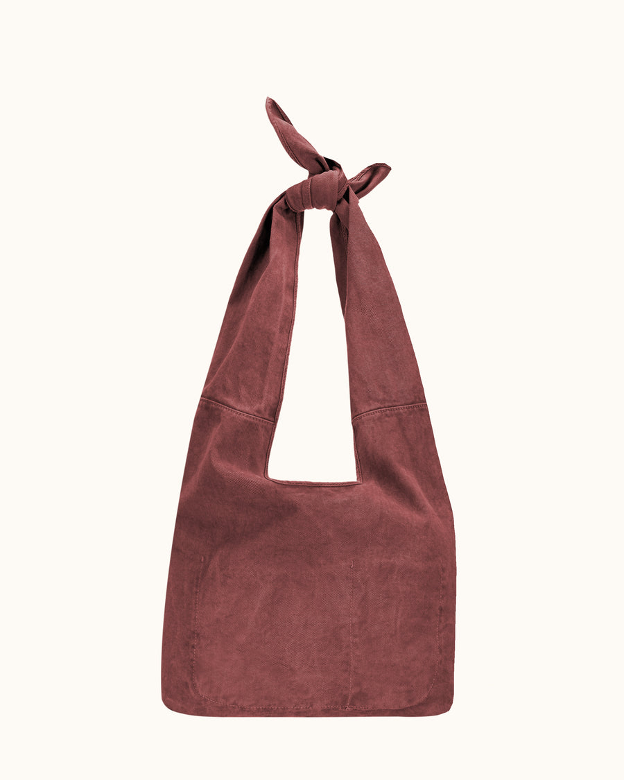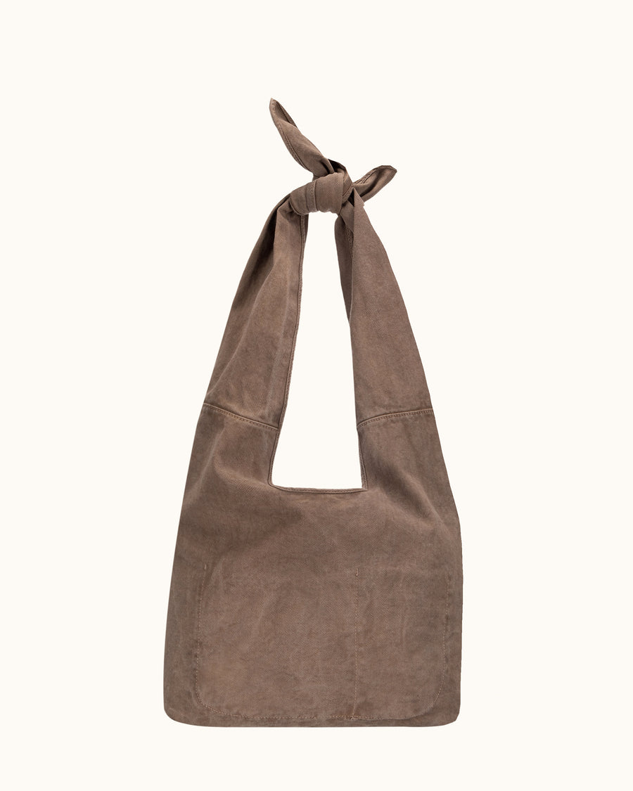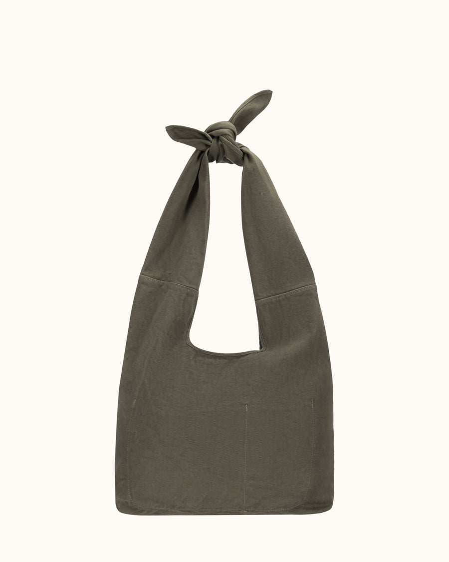 Worn as a shoulder bag or crossbody. Adjustable overhand knot. Dyed versions: 105cm armhole circumference. 65cm arm length. 14 liter capacity. Bias tape finishing. Internal pockets with exterior stitch.