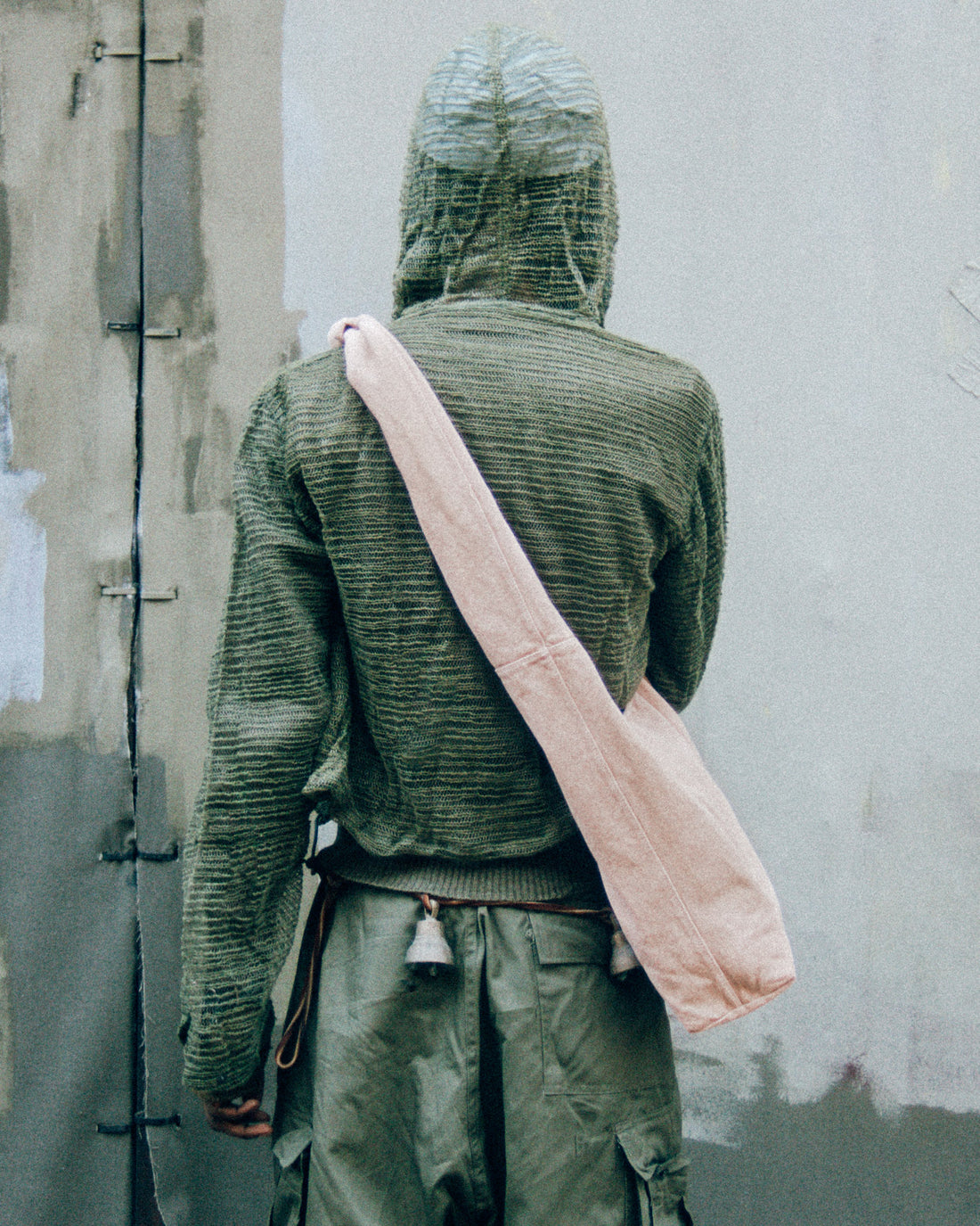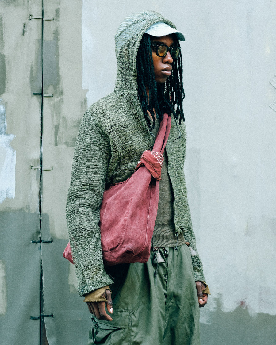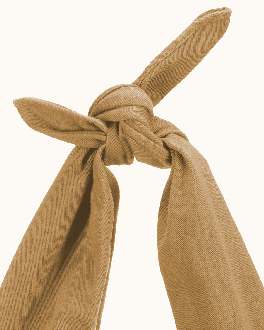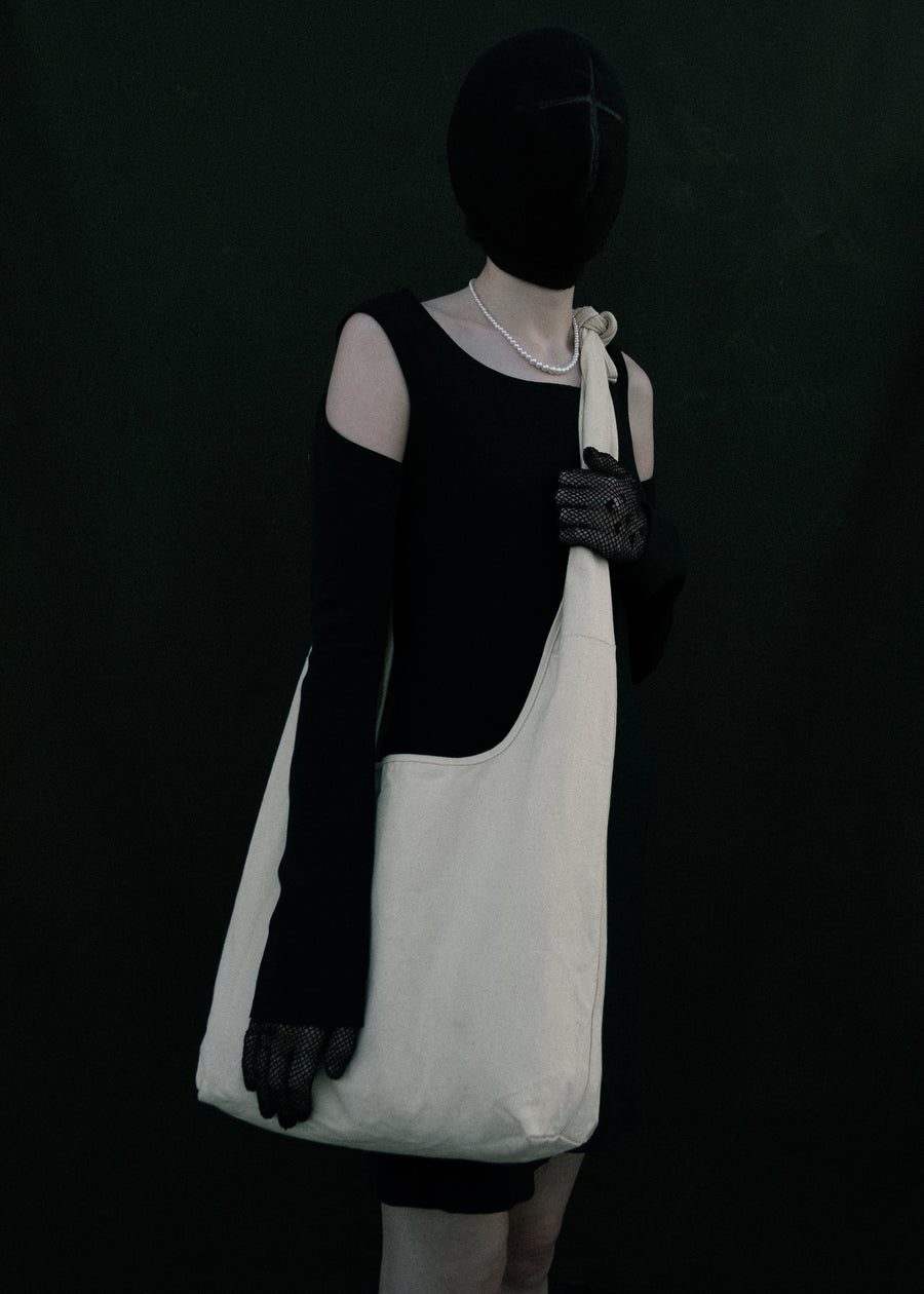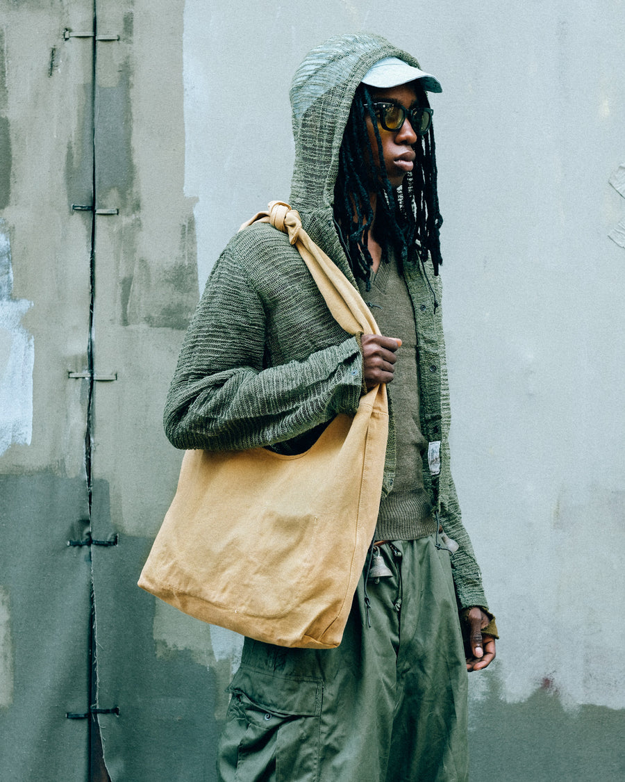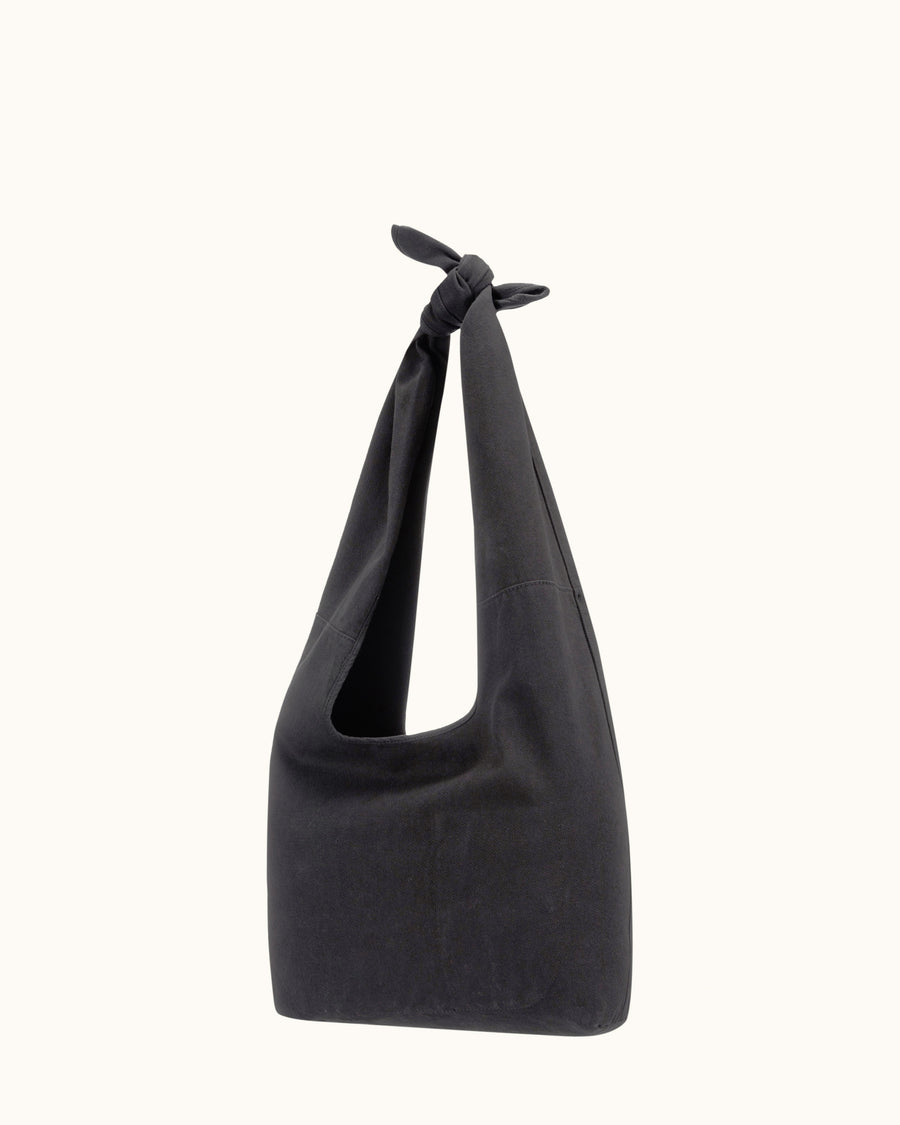 Worn as a shoulder bag or crossbody. Adjustable overhand knot. Dyed versions: 105cm armhole circumference. 65cm arm length. 14 liter capacity. Bias tape finishing. Internal pockets with exterior stitch.