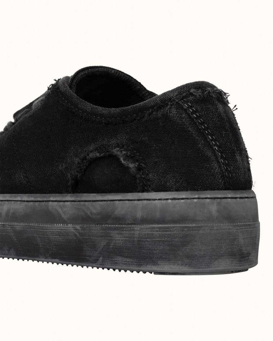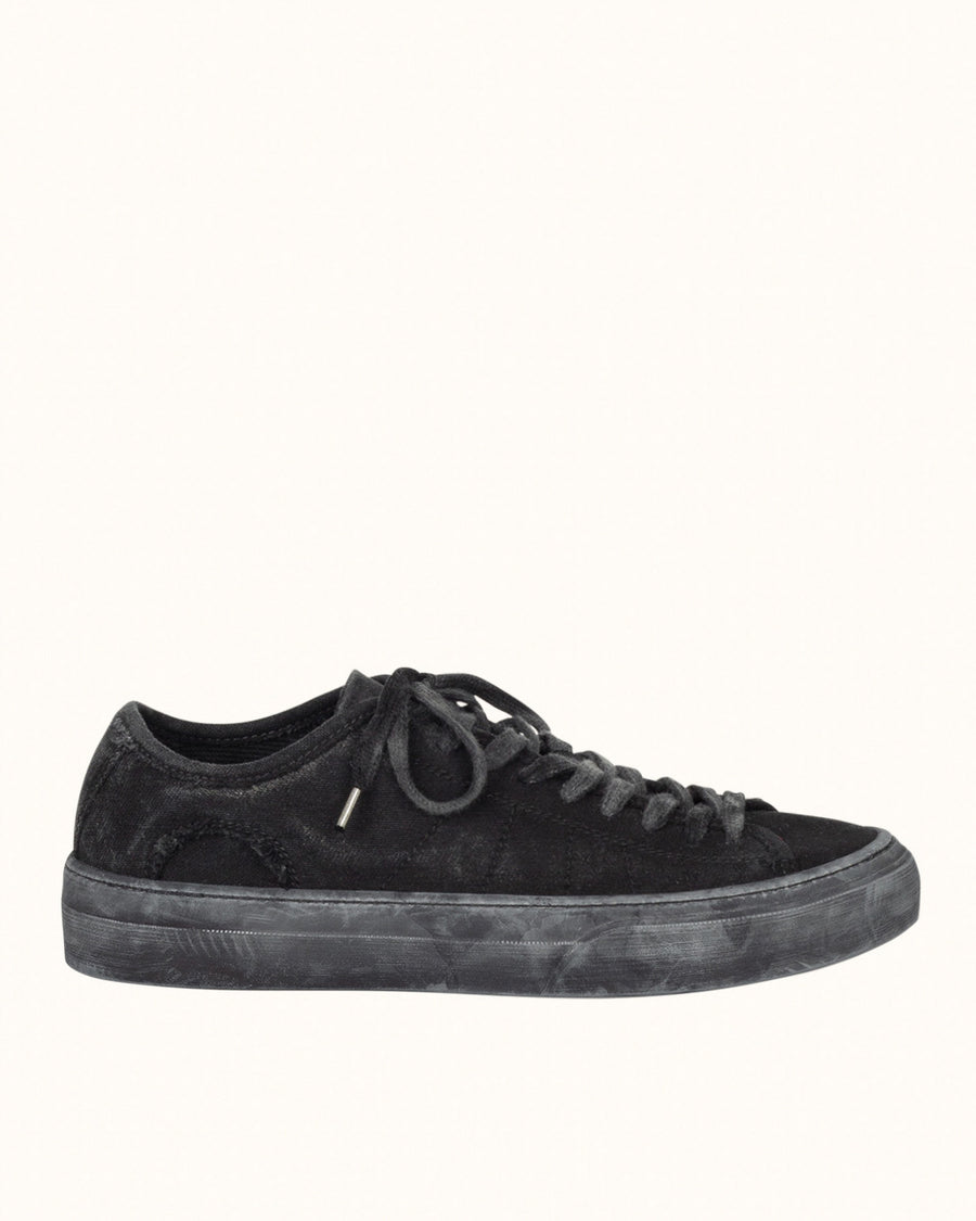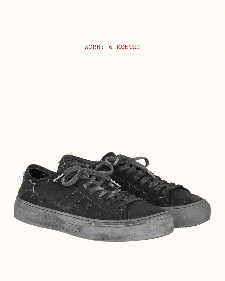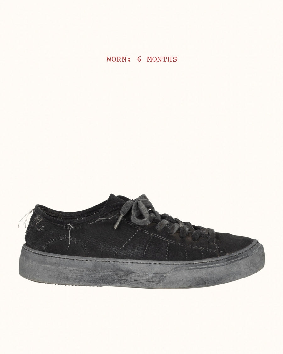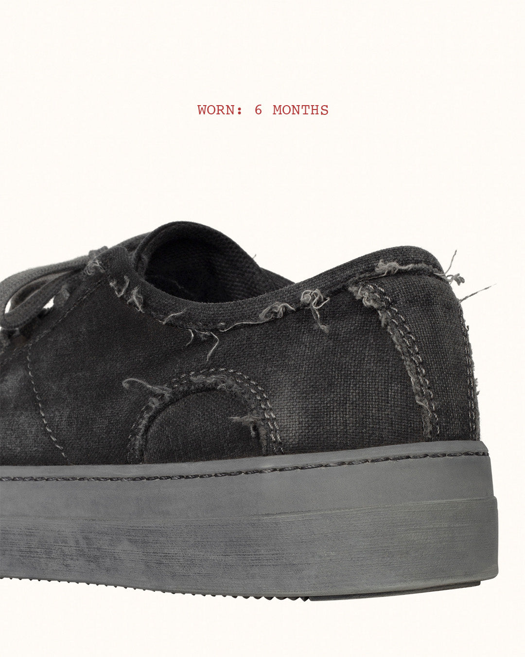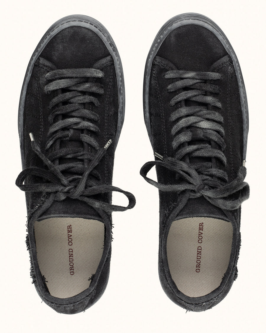 Swiss-army knife sneaker. Post-production mineral dye. Low top with thick sole and sleek upper. Elongated eye stays. Flat laces with metal aglet. Raw edges with bias cut trim. Removable cork insole. Genderless sizing. Tsuno Bag included.