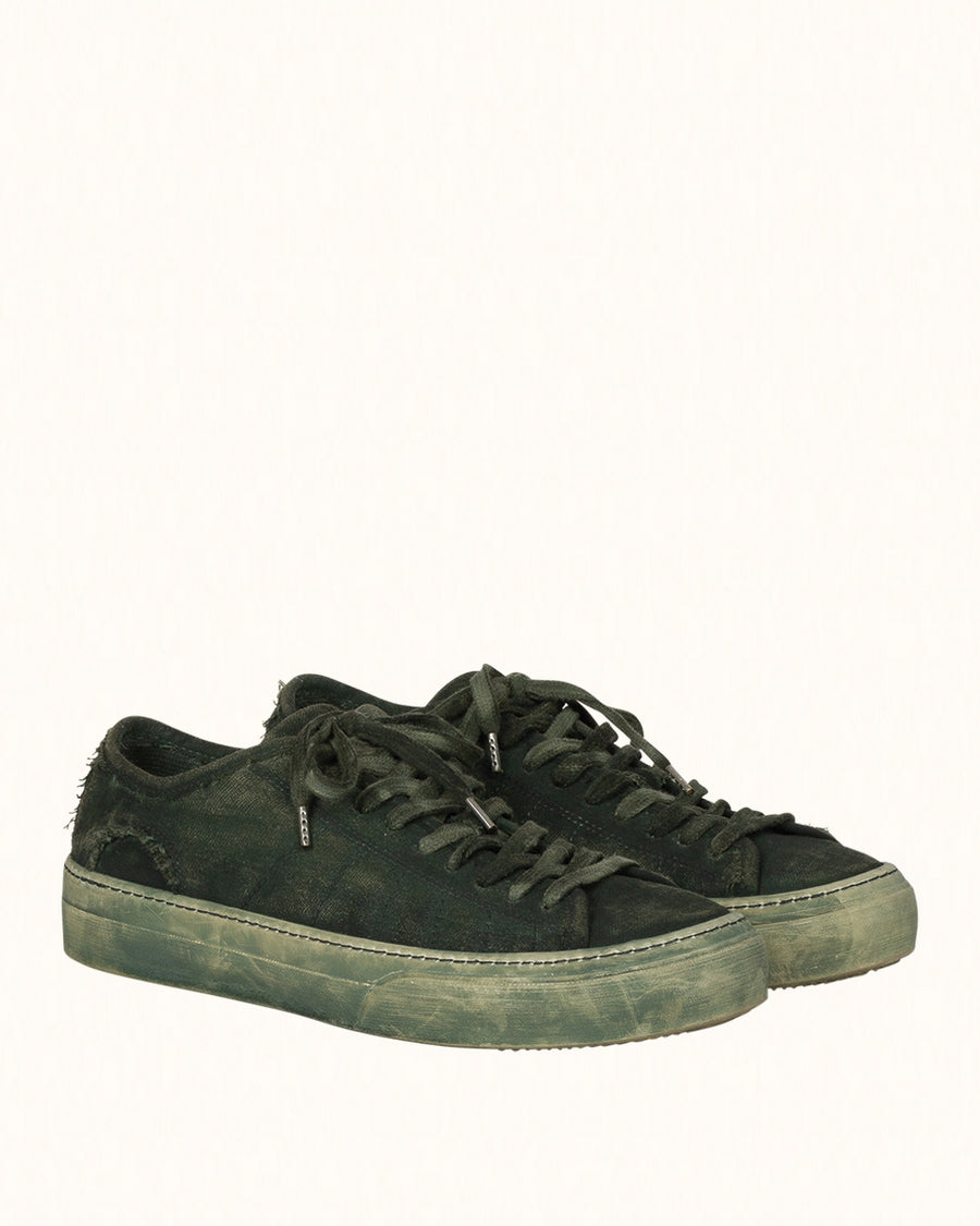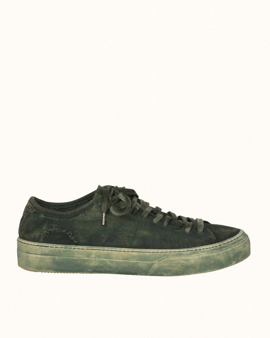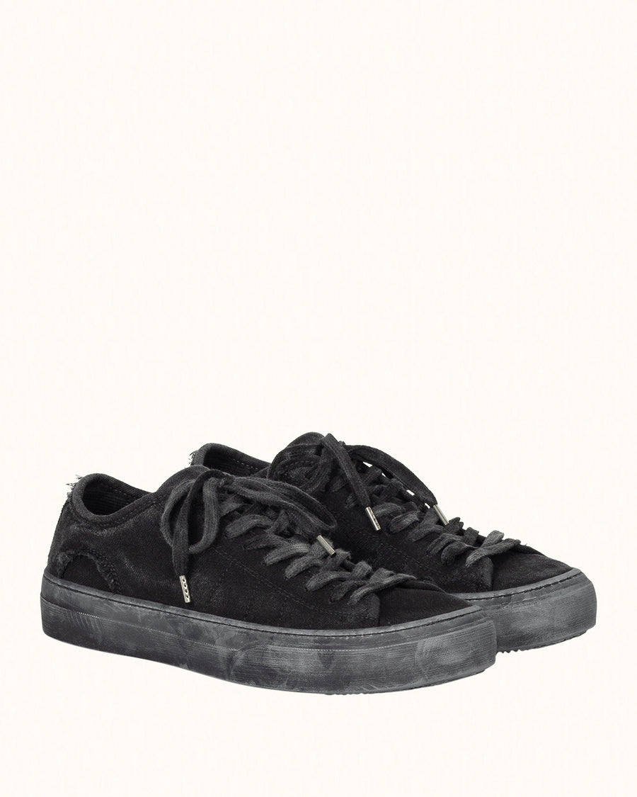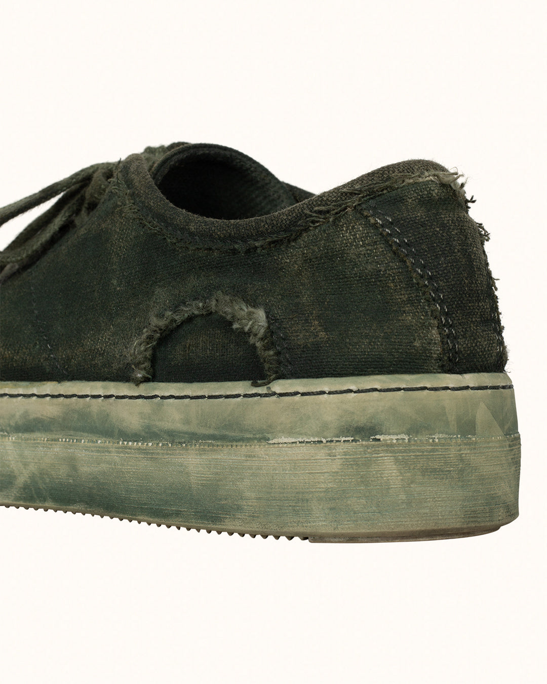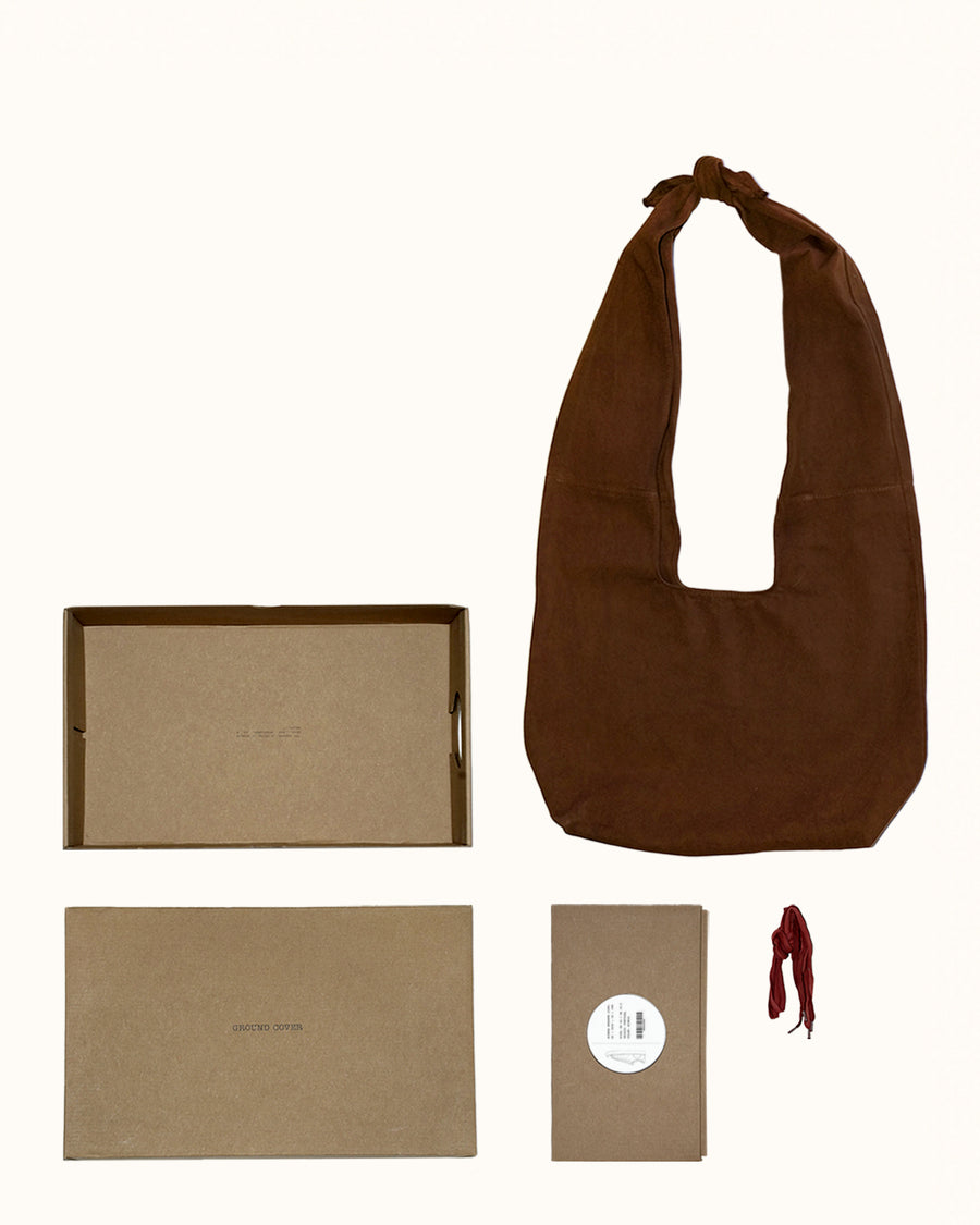 Swiss-army knife sneaker. Post-production mineral dye. Low top with thick sole and sleek upper. Elongated eye stays. Flat laces with metal aglet. Raw edges with bias cut trim. Removable cork insole. Genderless sizing. Tsuno Bag included.