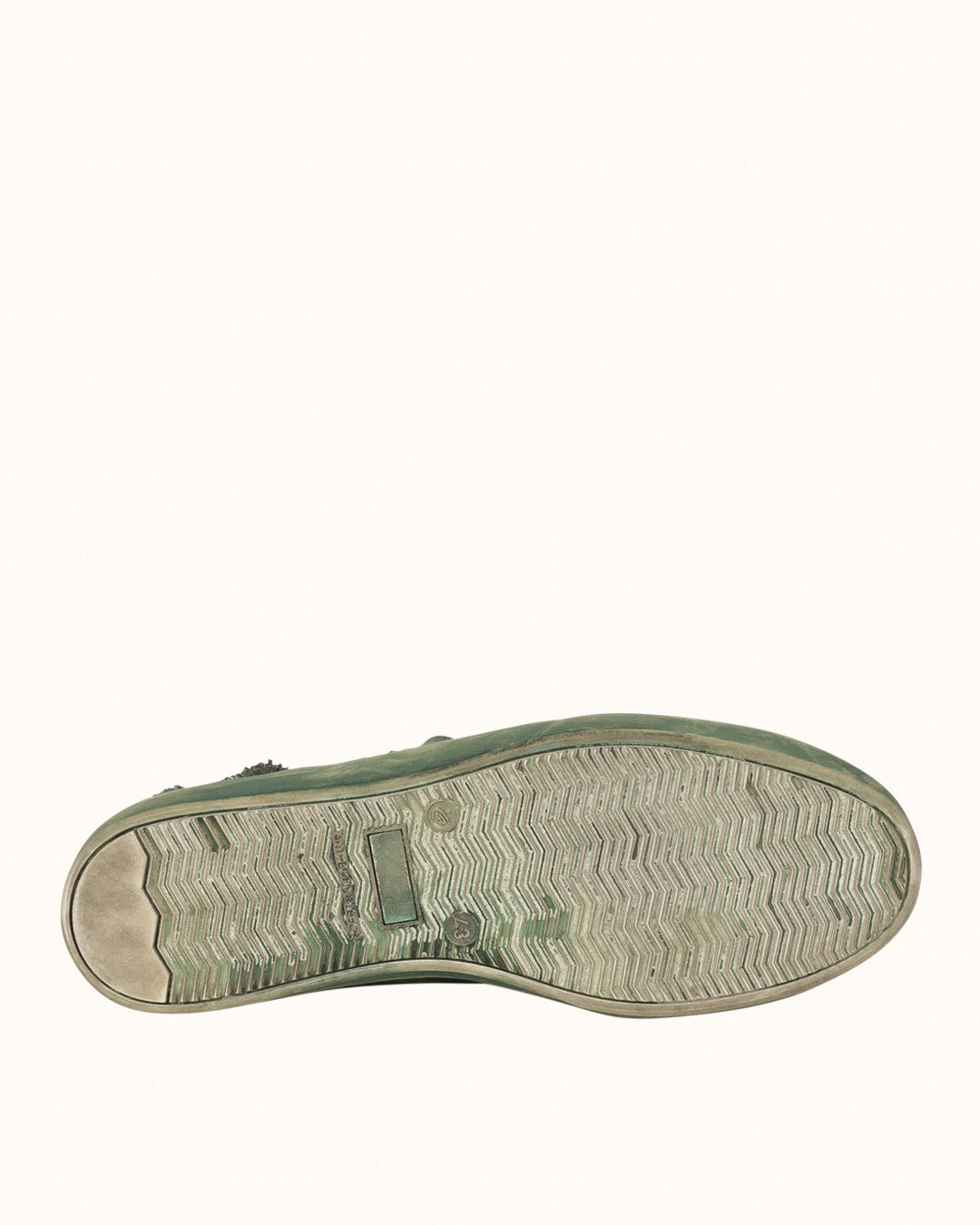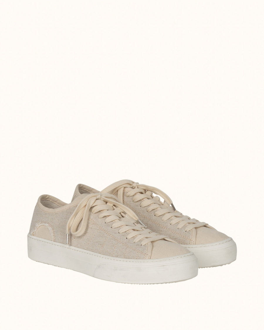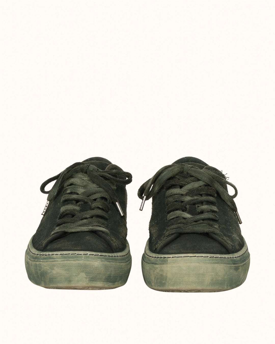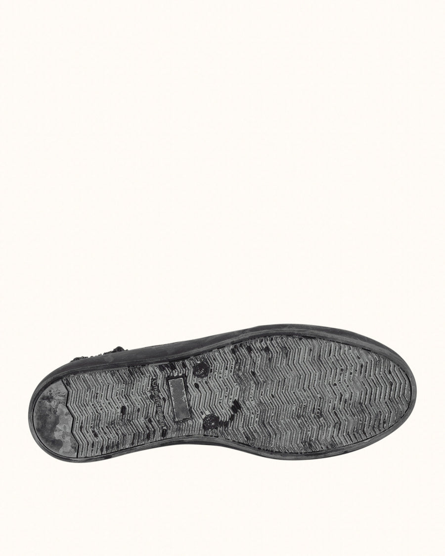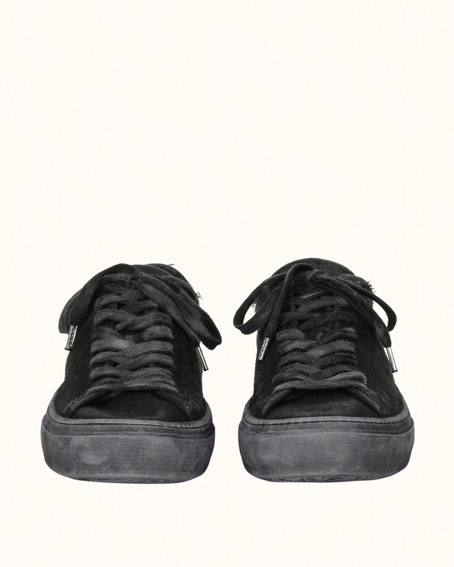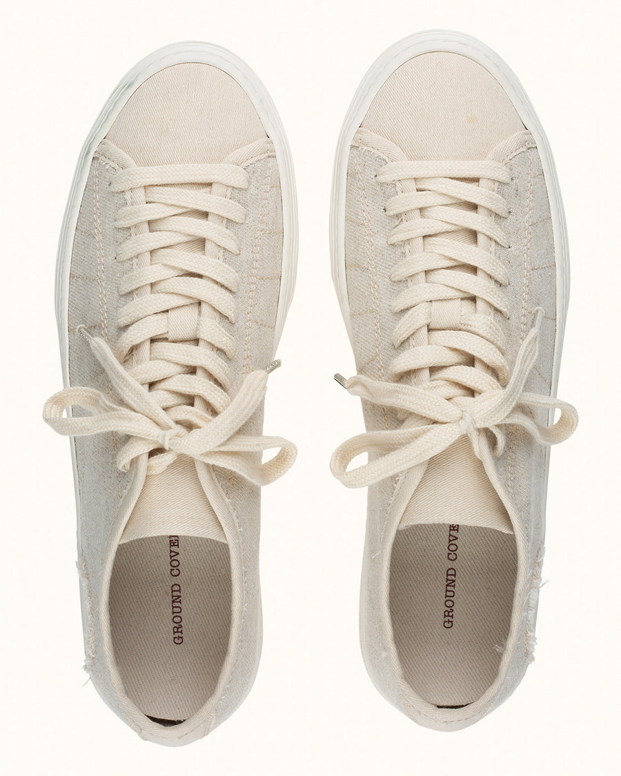 Swiss-army knife sneaker. Post-production mineral dye. Low top with thick sole and sleek upper. Elongated eye stays. Flat laces with metal aglet. Raw edges with bias cut trim. Removable cork insole. Genderless sizing. Tsuno Bag included.