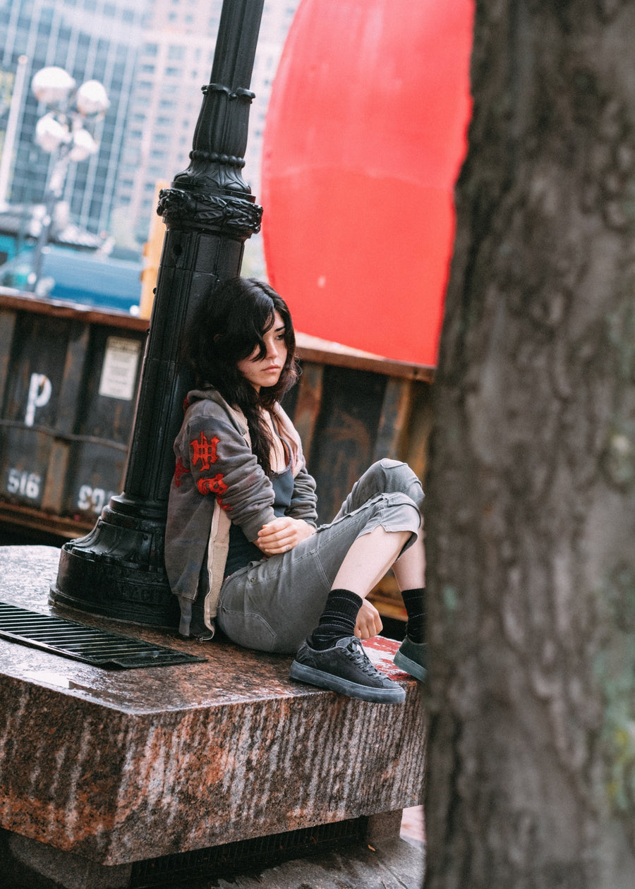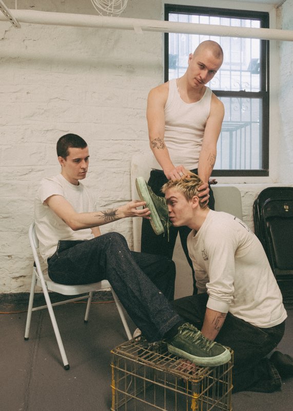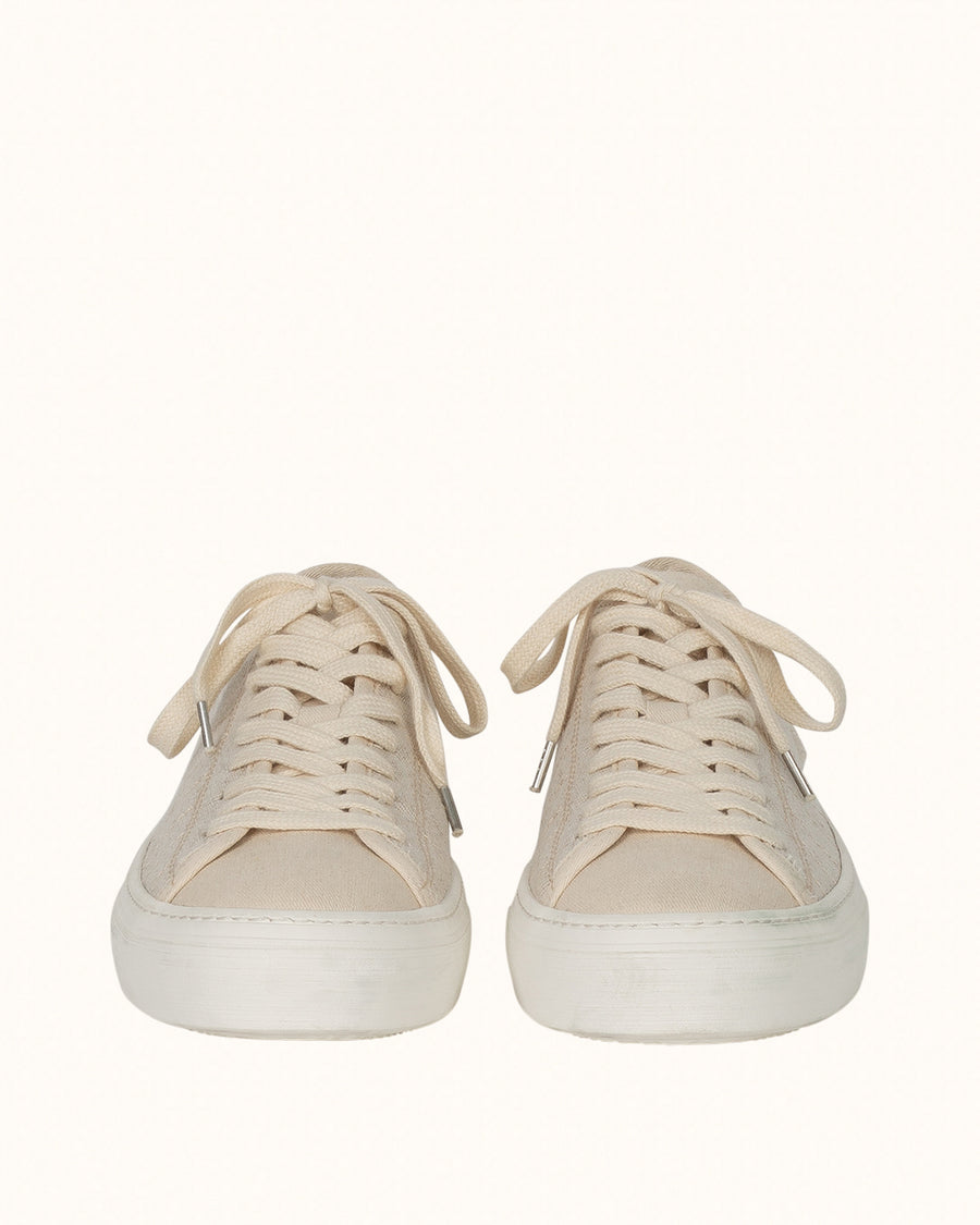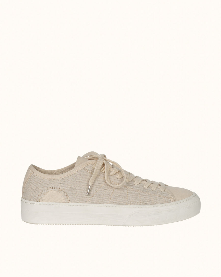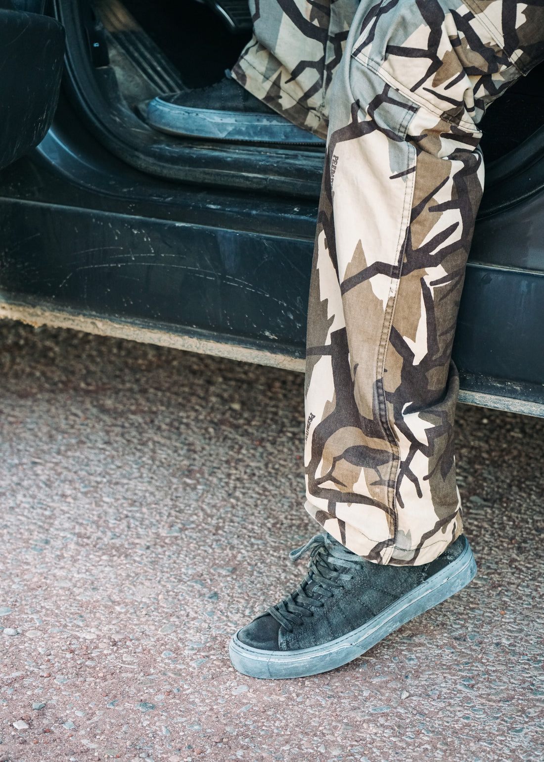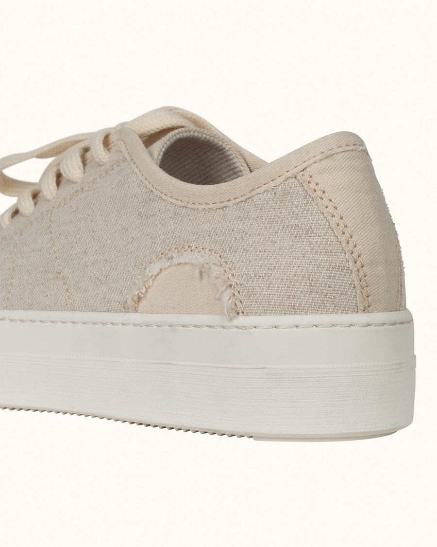 Swiss-army knife sneaker. Post-production mineral dye. Low top with thick sole and sleek upper. Elongated eye stays. Flat laces with metal aglet. Raw edges with bias cut trim. Removable cork insole. Genderless sizing. Tsuno Bag included.