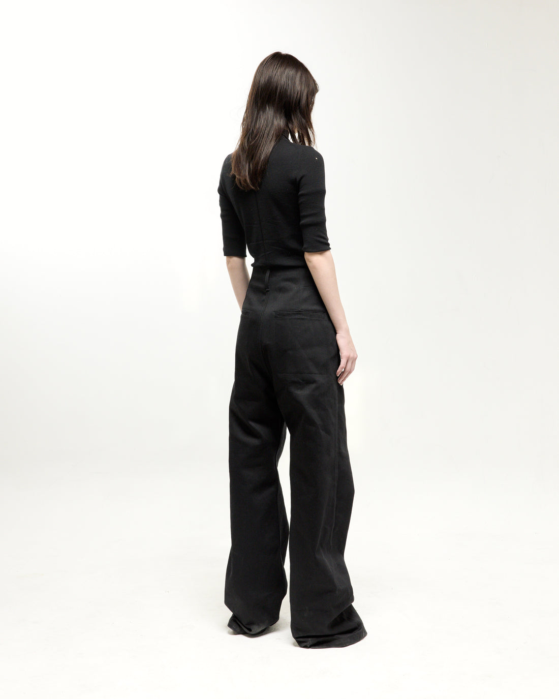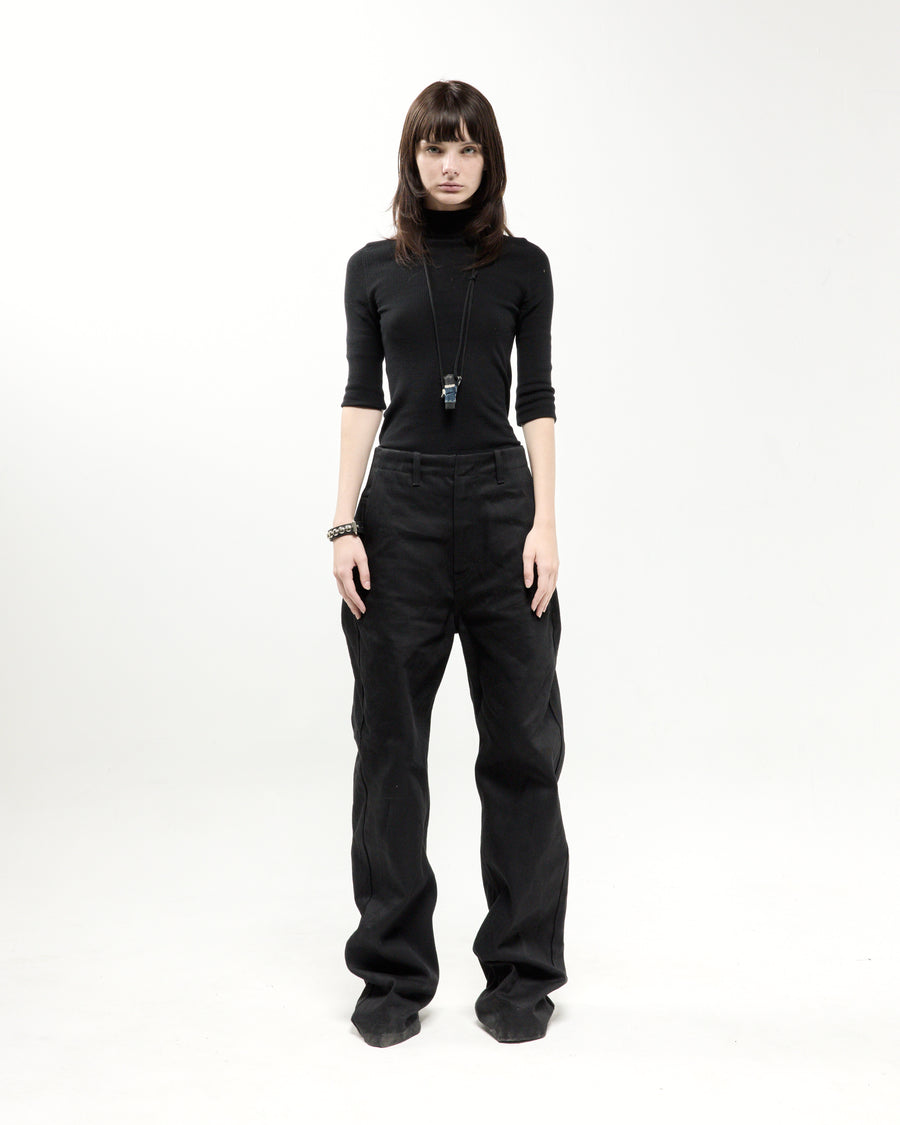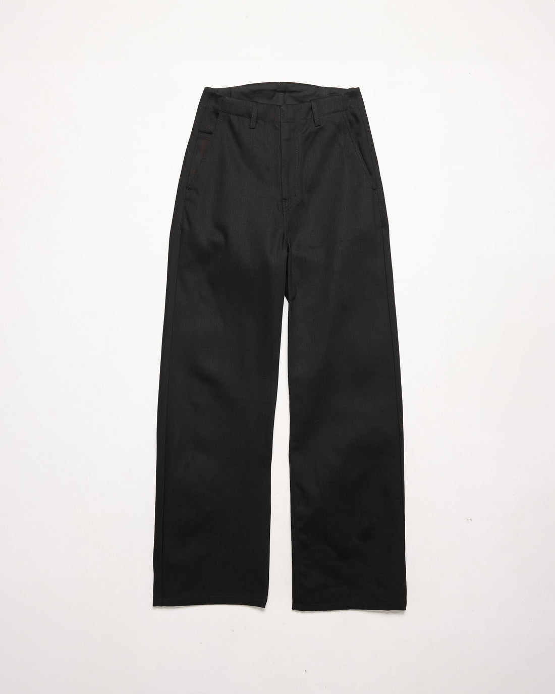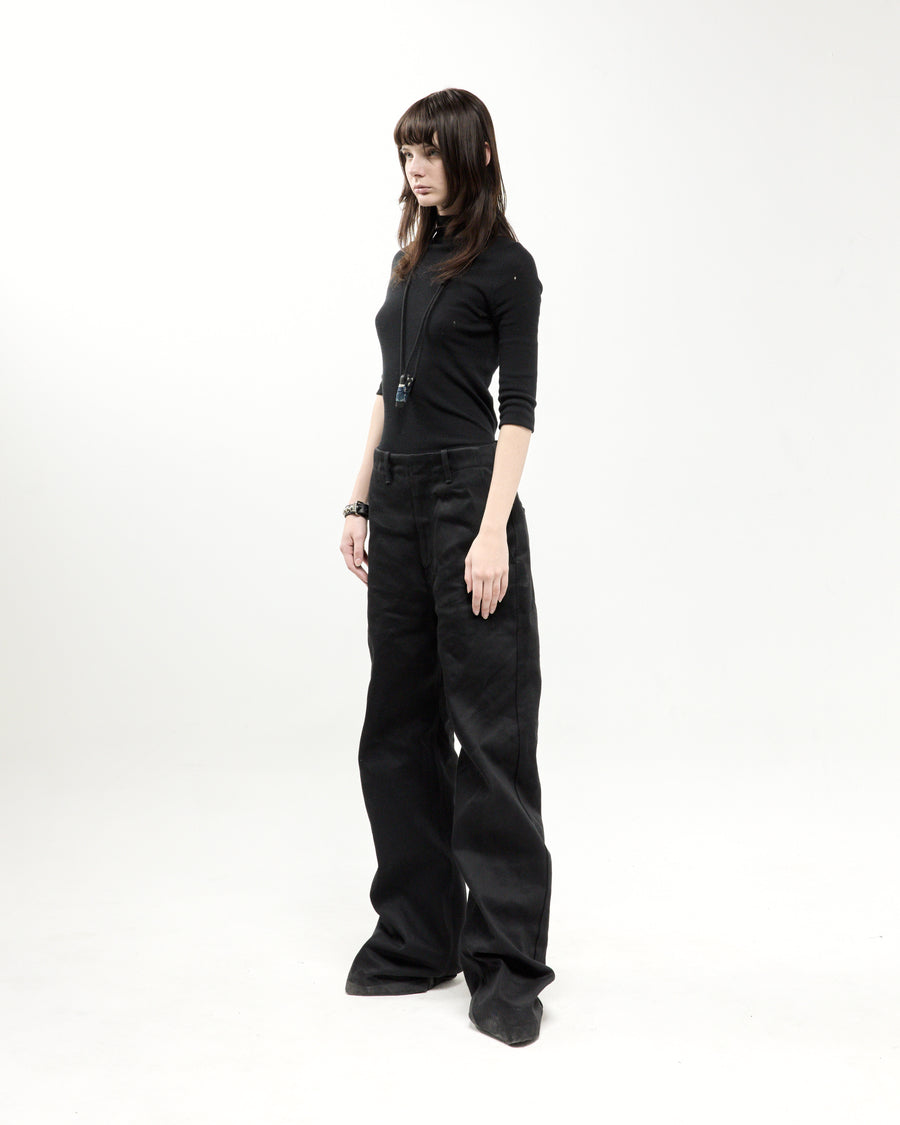 Waxing waistband protects lower back. Fitted at waist, baggy below it. Raw black on black twill weave milled in Japan. 14.5 oz 100% cotton purchased secondhand in Los Angeles. Excella zipper. Darted rear shaping. Welt pockets with top stitch. Formal yet ardent.