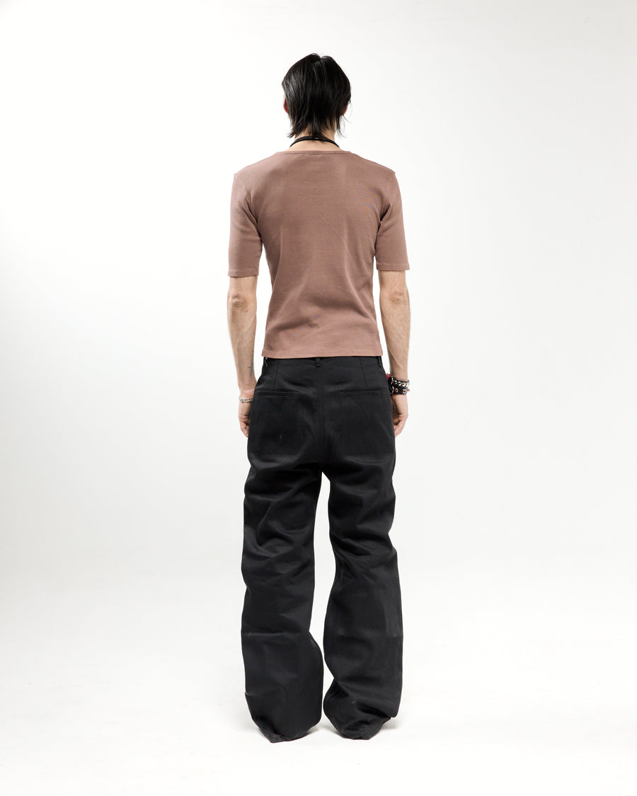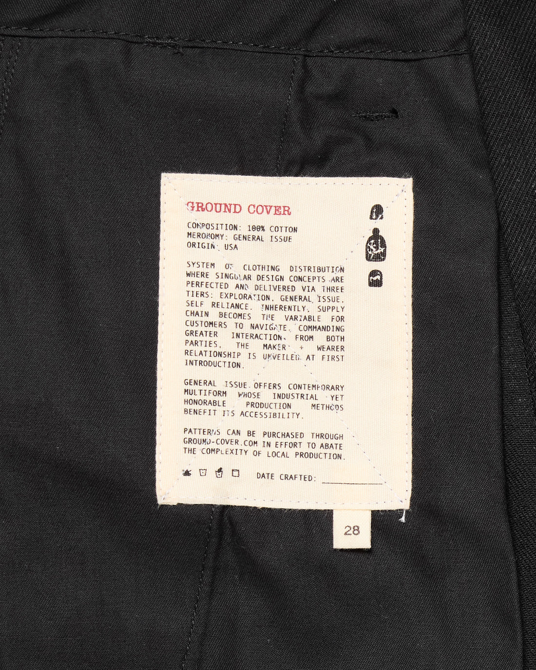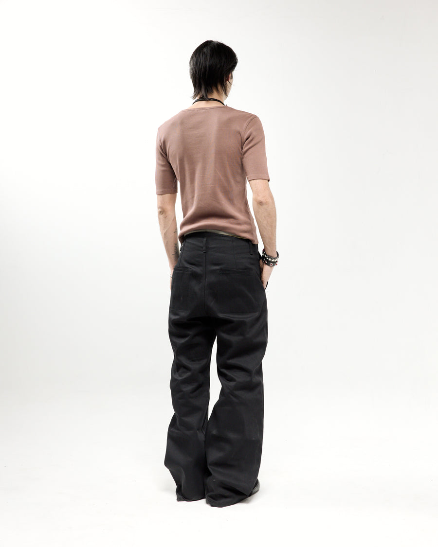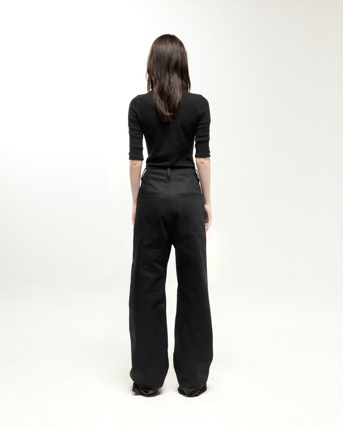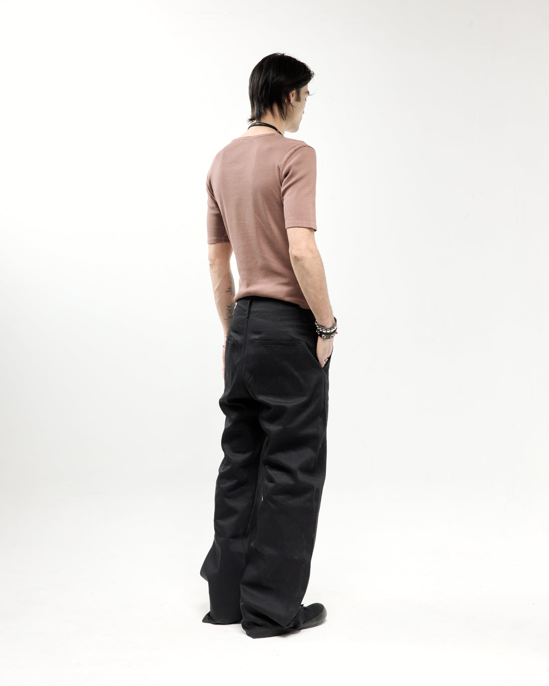 Waxing waistband protects lower back. Fitted at waist, baggy below it. Raw black on black twill weave milled in Japan. 14.5 oz 100% cotton purchased secondhand in Los Angeles. Excella zipper. Darted rear shaping. Welt pockets with top stitch. Formal yet ardent.