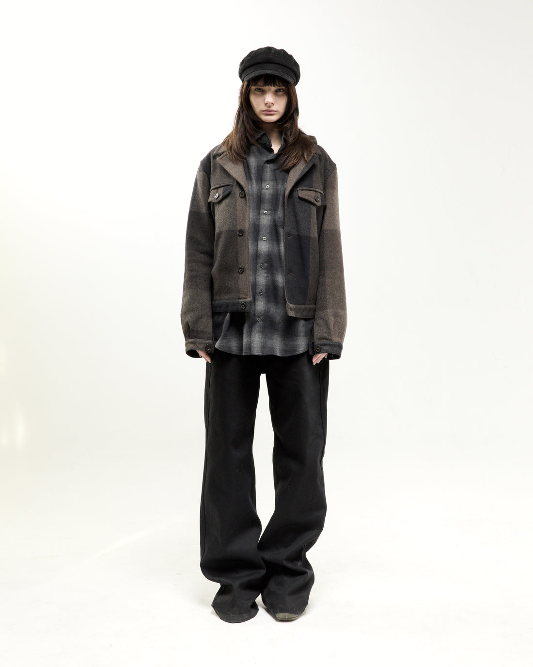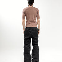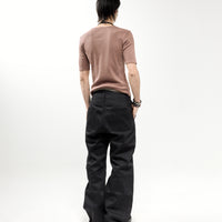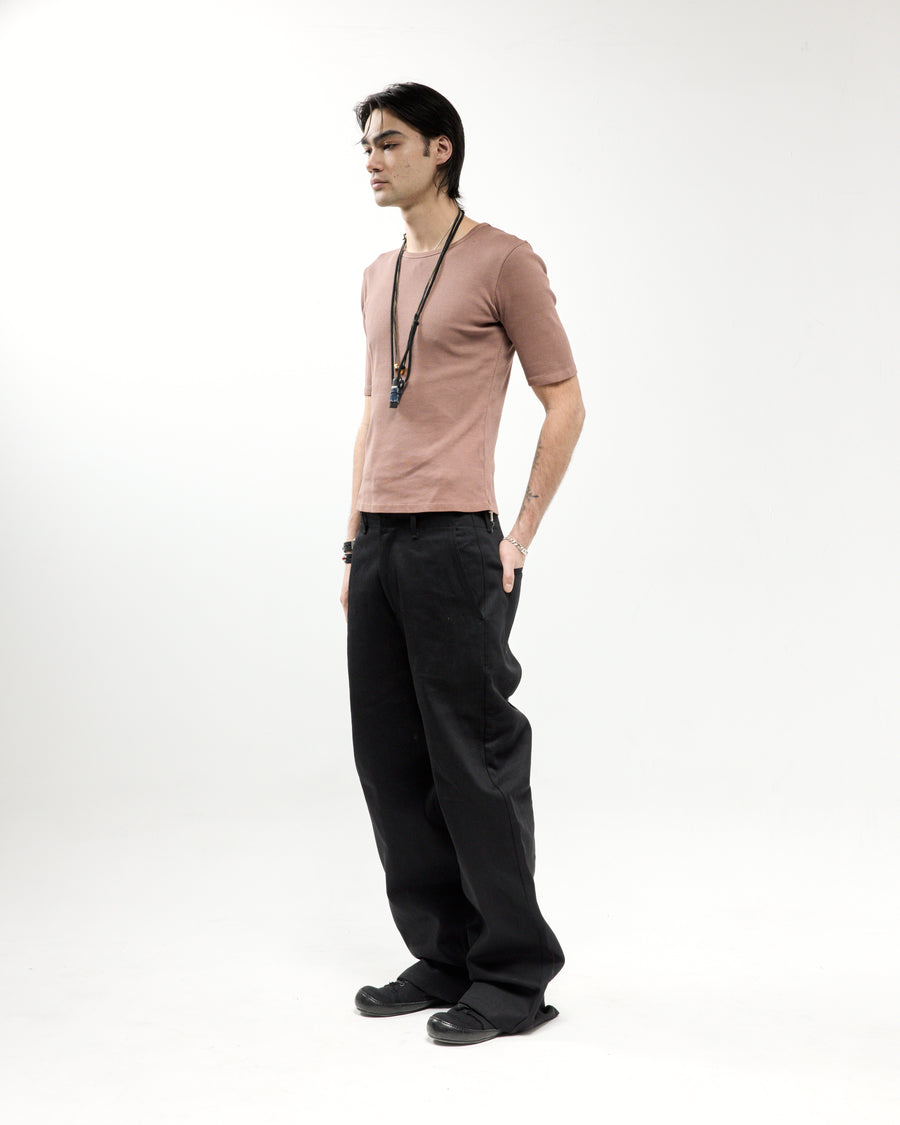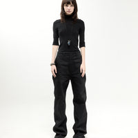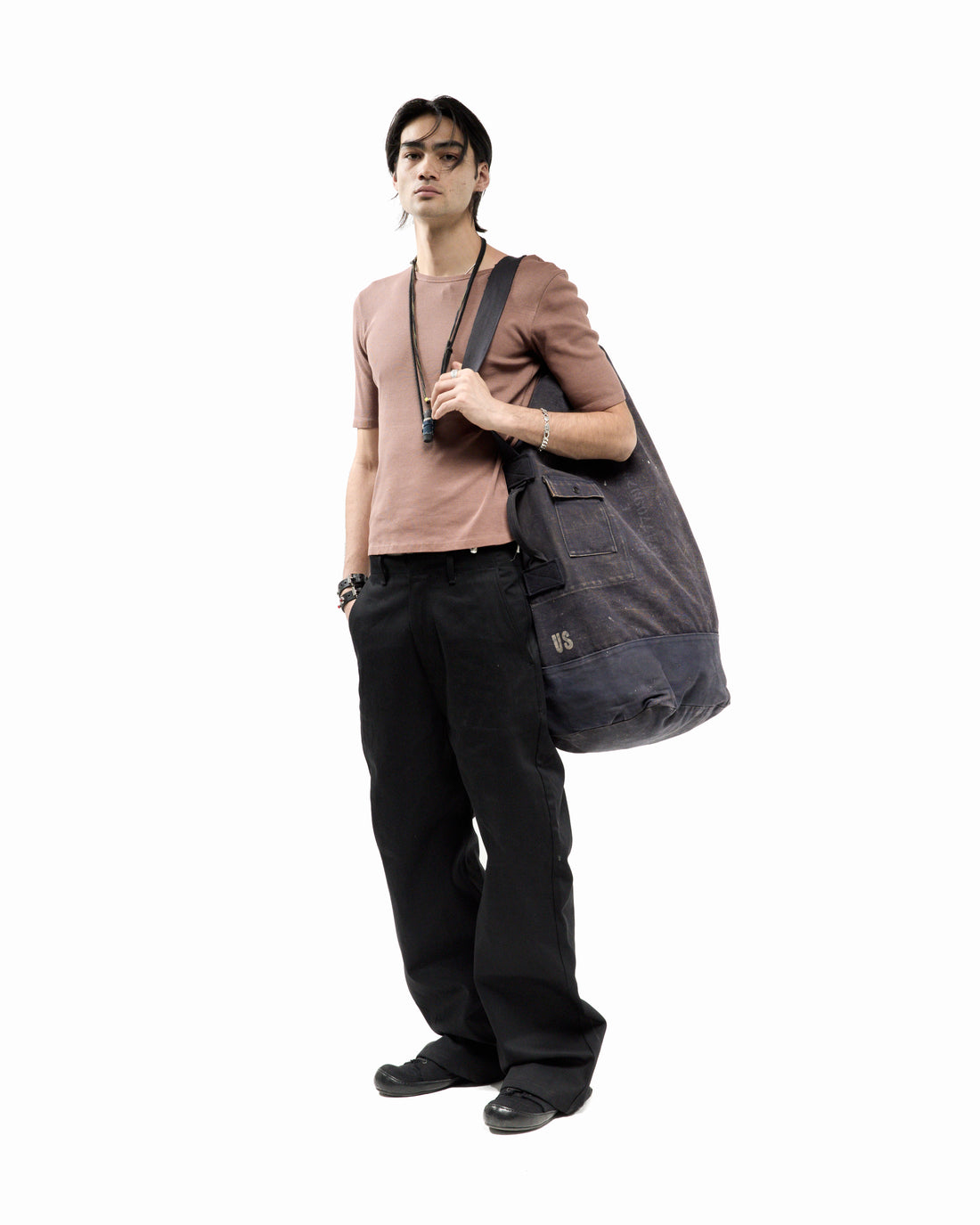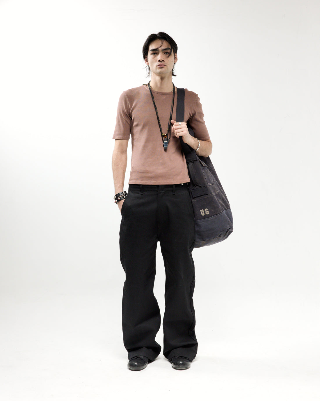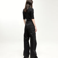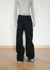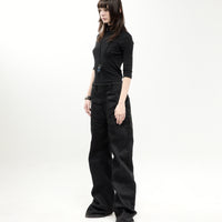 Waxing waistband protects lower back. Fitted at waist, baggy below it. Raw black on black twill weave milled in Japan. 14.5 oz 100% cotton purchased secondhand in Los Angeles. Excella zipper. Darted rear shaping. Welt pockets with top stitch. Formal yet ardent.