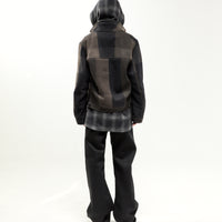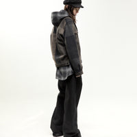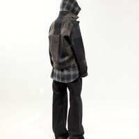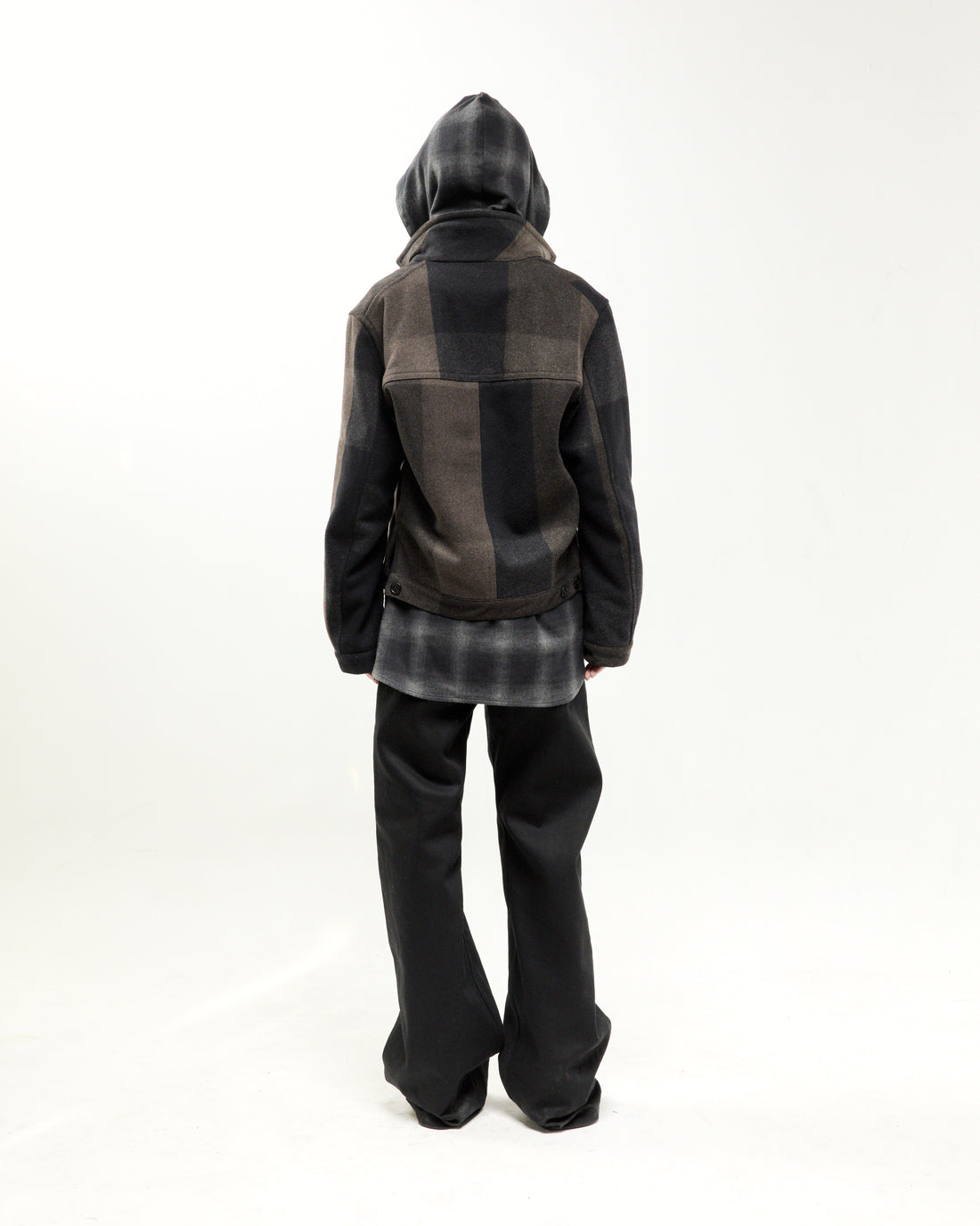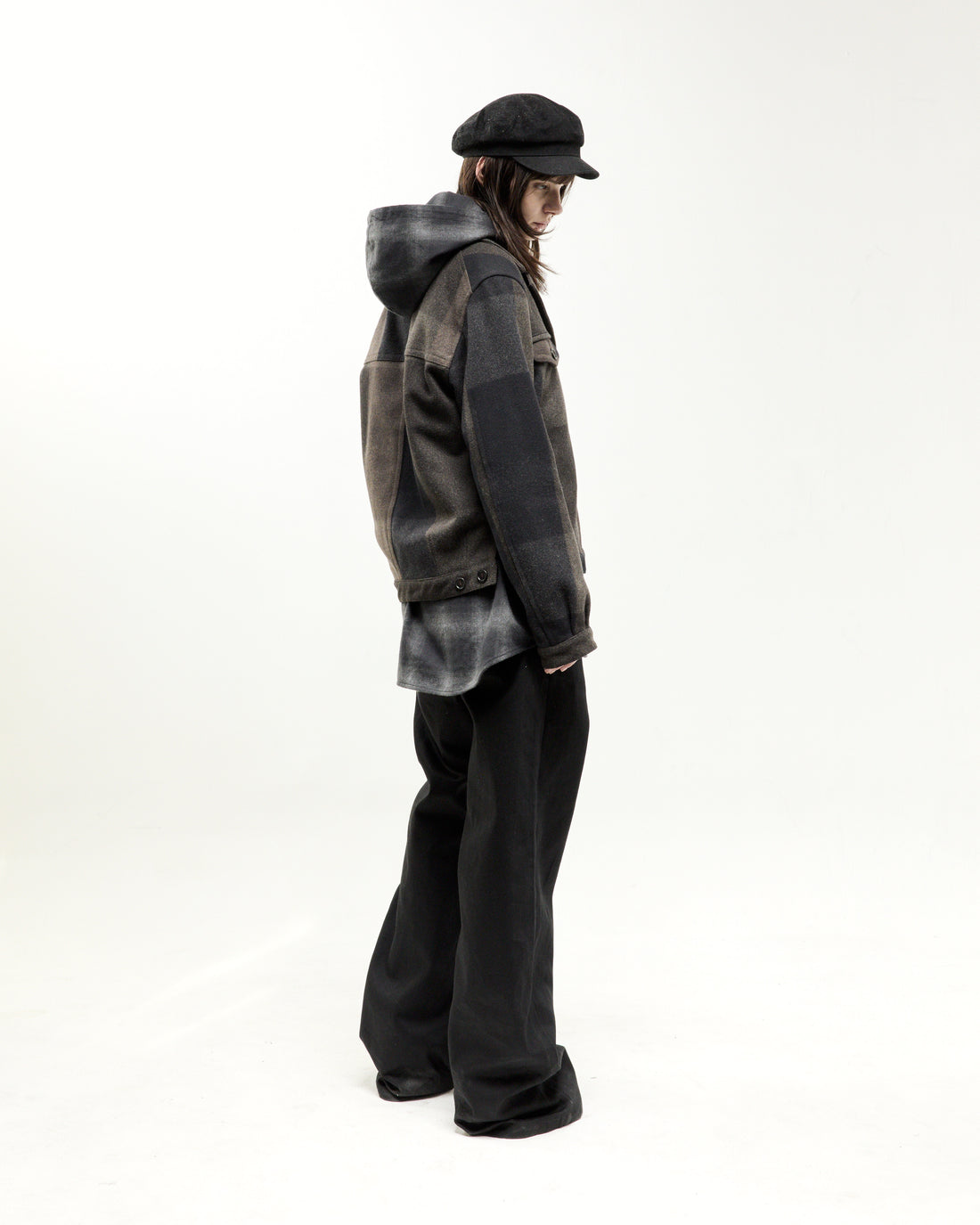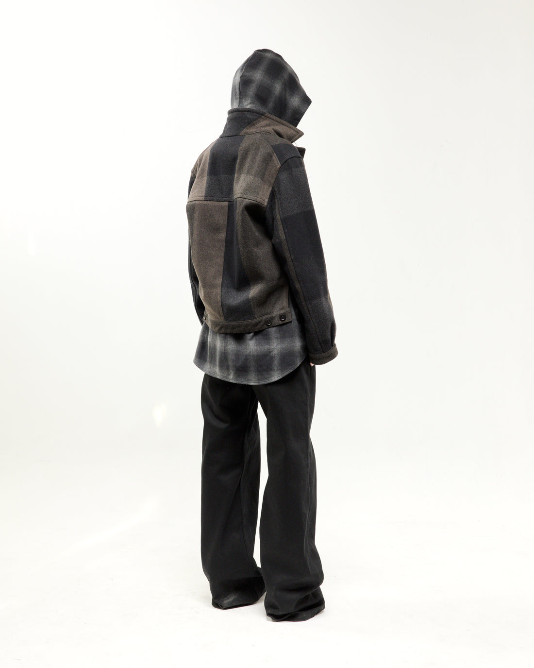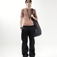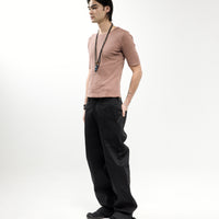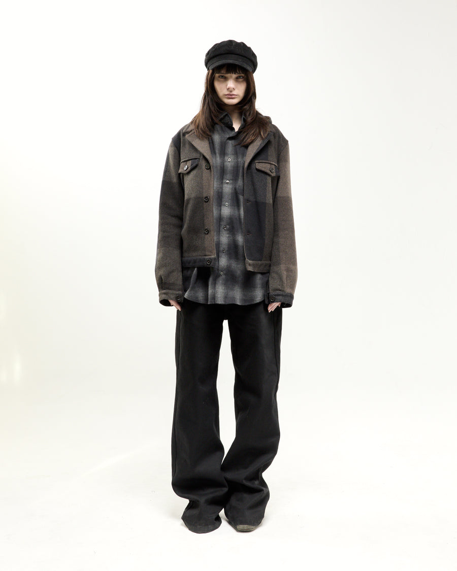 Waxing waistband protects lower back. Fitted at waist, baggy below it. Raw black on black twill weave milled in Japan. 14.5 oz 100% cotton purchased secondhand in Los Angeles. Excella zipper. Darted rear shaping. Welt pockets with top stitch. Formal yet ardent.